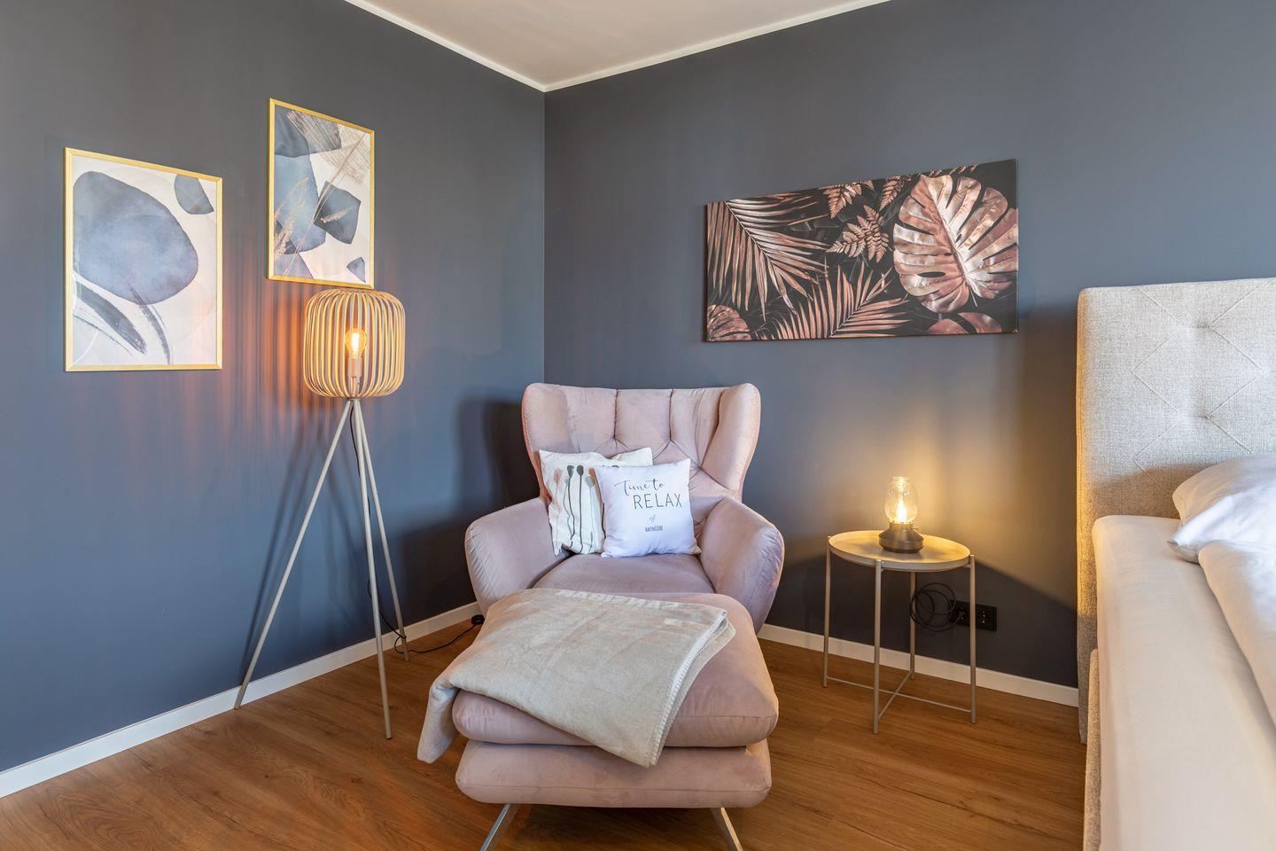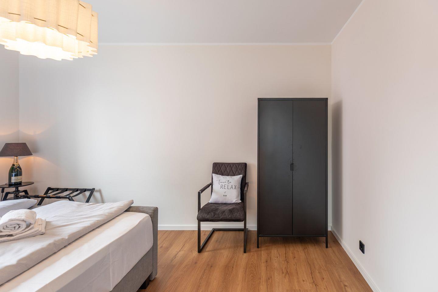 Das erste Schlafzimmer ist großzügig geschnitten und stilvoll eingerichtet. Der Raum ist in ruhigen, abgestimmten Farben gehalten und schafft mit seiner modernen Gestaltung eine entspannte Atmosphäre. Mittelpunkt ist das große Boxspringbett (180 x 200 cm) mit gepolstertem Kopfteil, das für erholsamen Schlaf sorgt. Ein gemütlicher Sessel mit Hocker lädt zum Lesen oder Ausruhen ein, während der Flachbildfernseher an der Wand für Unterhaltung sorgt. Auch vom Schlafzimmer aus haben Sie Zugang zum Balkon. Ideal um morgens bei geöffneten Fenstern frische Hafenluft zu genießen. Auch das zweite Schlafzimmer ist mit einem bequemen Boxspringbett (180 x 200 cm) ausgestattet und bietet eine angenehme, ruhige Atmosphäre. Ein kleiner Sessel sowie ein Kleiderschrank stehen zur Verfügung und ergänzen die praktische Ausstattung.
