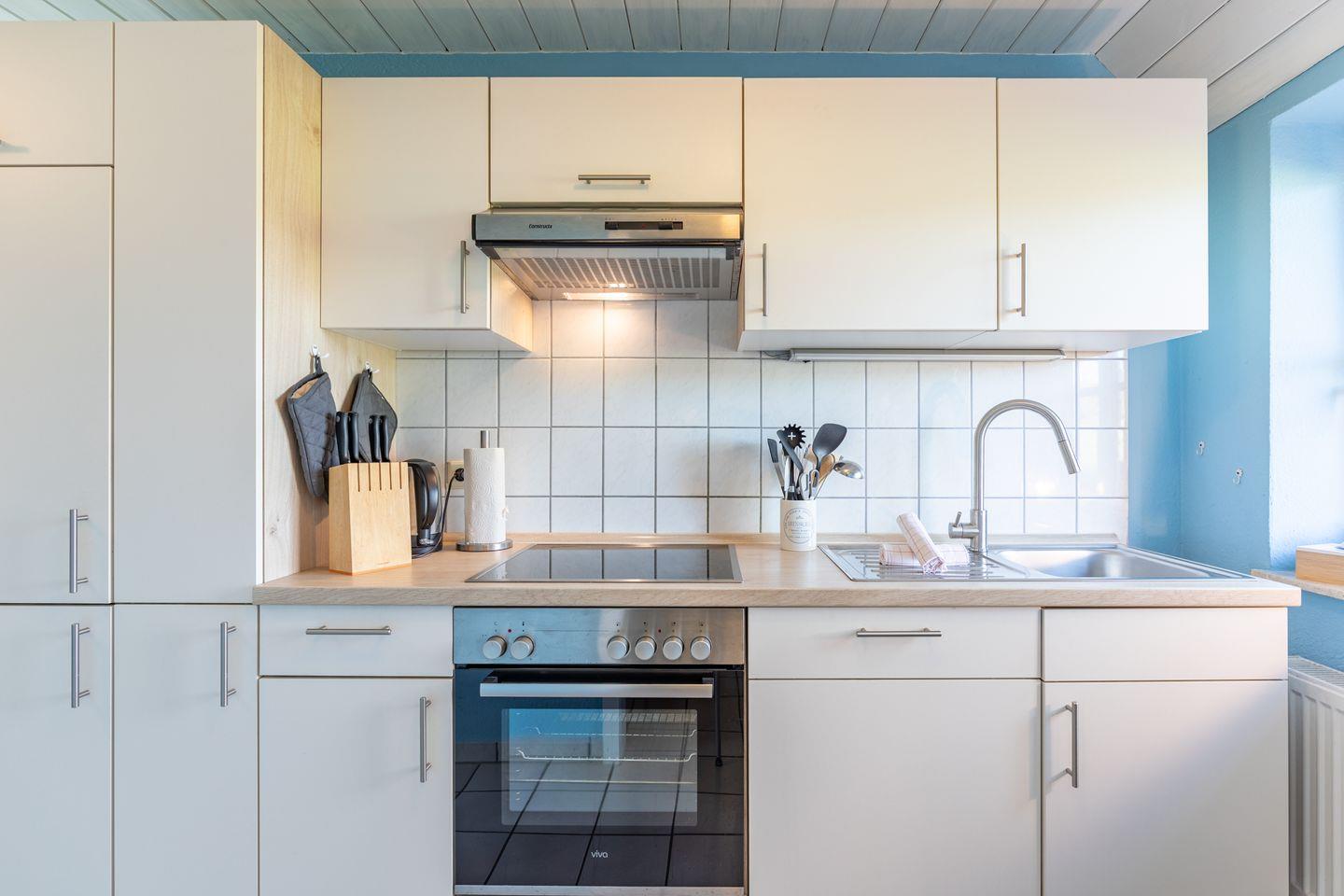 Die offene Küche mit Backofen, 4-Plattenherd, Geschirrspüler, Toaster, Kaffeemaschine (Filtergröße 4), Wasserkocher uvm. eignet sich hervorragend für Selbstversorger.