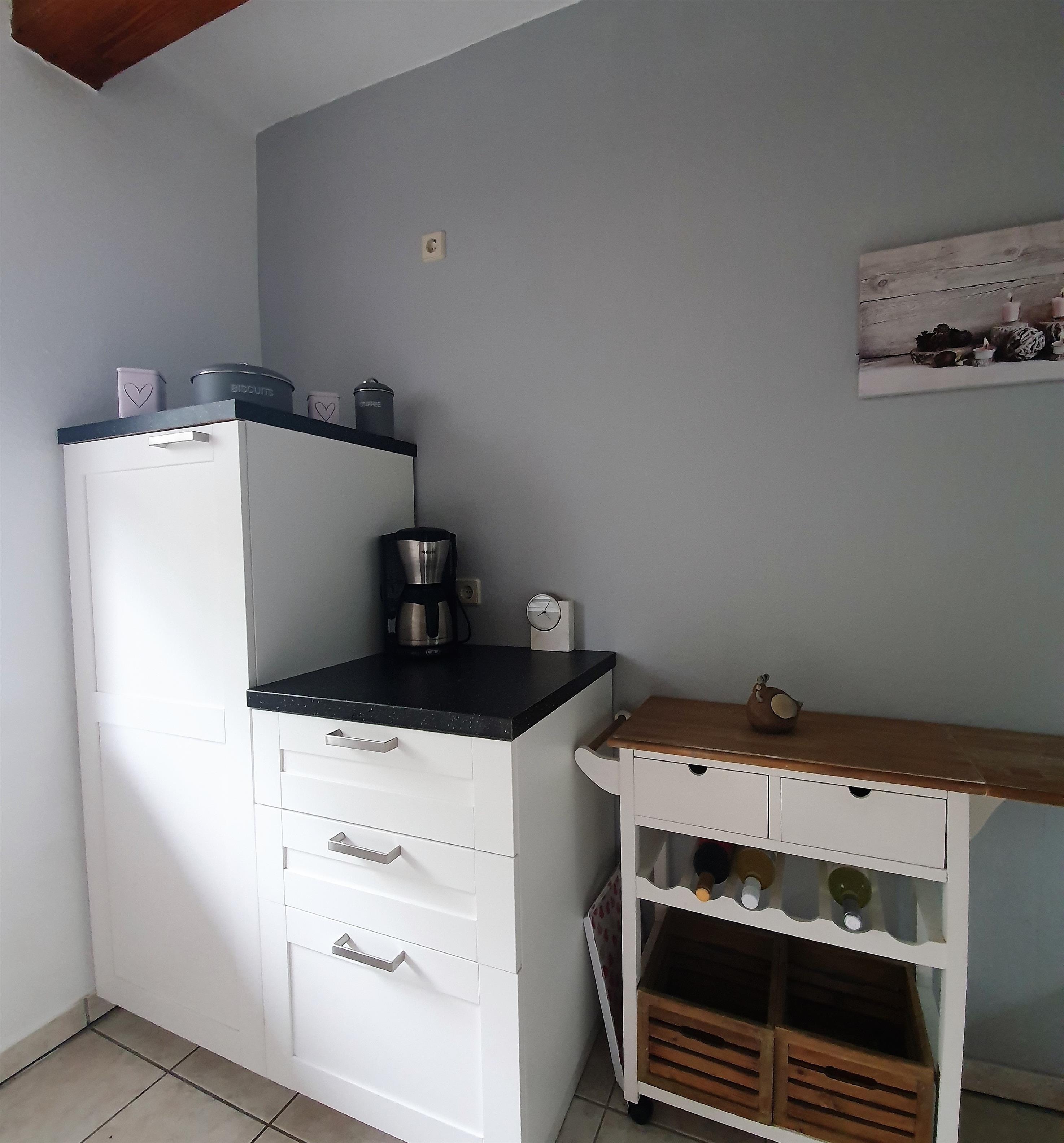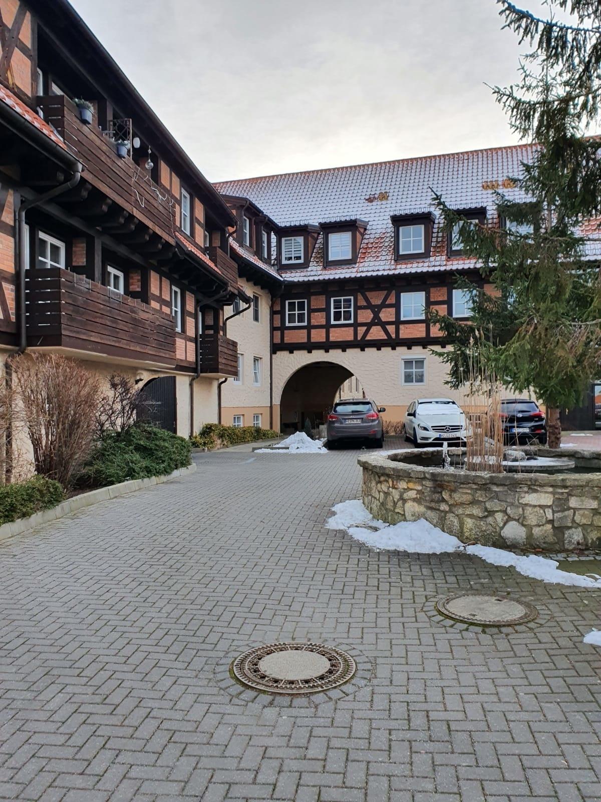 Die schöne große Wohnung (2 große Zimmer) befindet sich in der 1. Etage links einer Fachwerk-Wohnanlage. Holzbalken unter der Decke in jedem Raum. Die Wohnung wurde 2023 völlig neu eingerichtet .