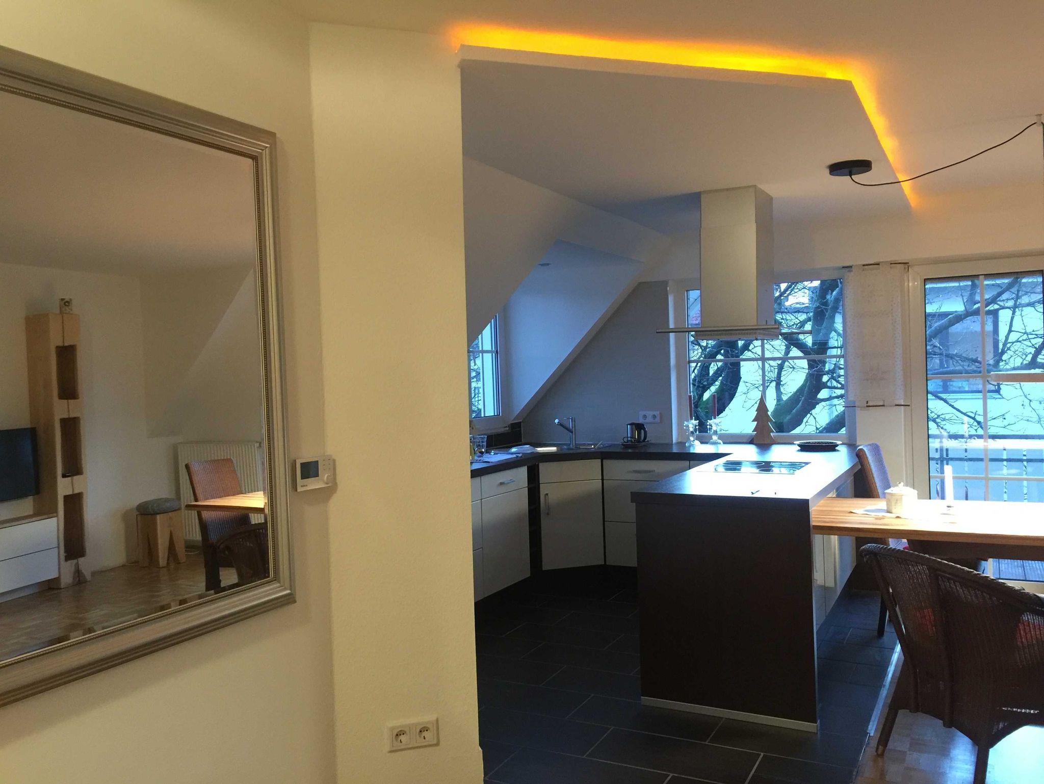 Stadtwohnung in ruhiger versteckter Lage, fußläufig zur Innenstadt, exklusives Appartement, 60 qm in 2. Etage mit offener Küche, großer Esstisch und TV. Südbalkon, 1 Garage, 1 Stellplatz.Die lichtdurchflutete Wohnung in 2. Etage ist über das helle freundliche Treppenhaus zu erreichen. Sie hat eine großzügige Raumaufteilung mit massivholz Parkett. Das Badezimmer mit Fußbodenheizung ist neu renoviert! Das Haus liegt in einer verkehrsberuhigten Zone, außergewöhnlich ruhig. Im Schlafzimmer steht ein Doppelbett 180 x 200 cm ausgestattet mit orthopädisch wirksamen Matratzen, allergikerfreundlich - waschbare Bettwaren. Alle Fenster sind mit Rolläden ausgestattet.
