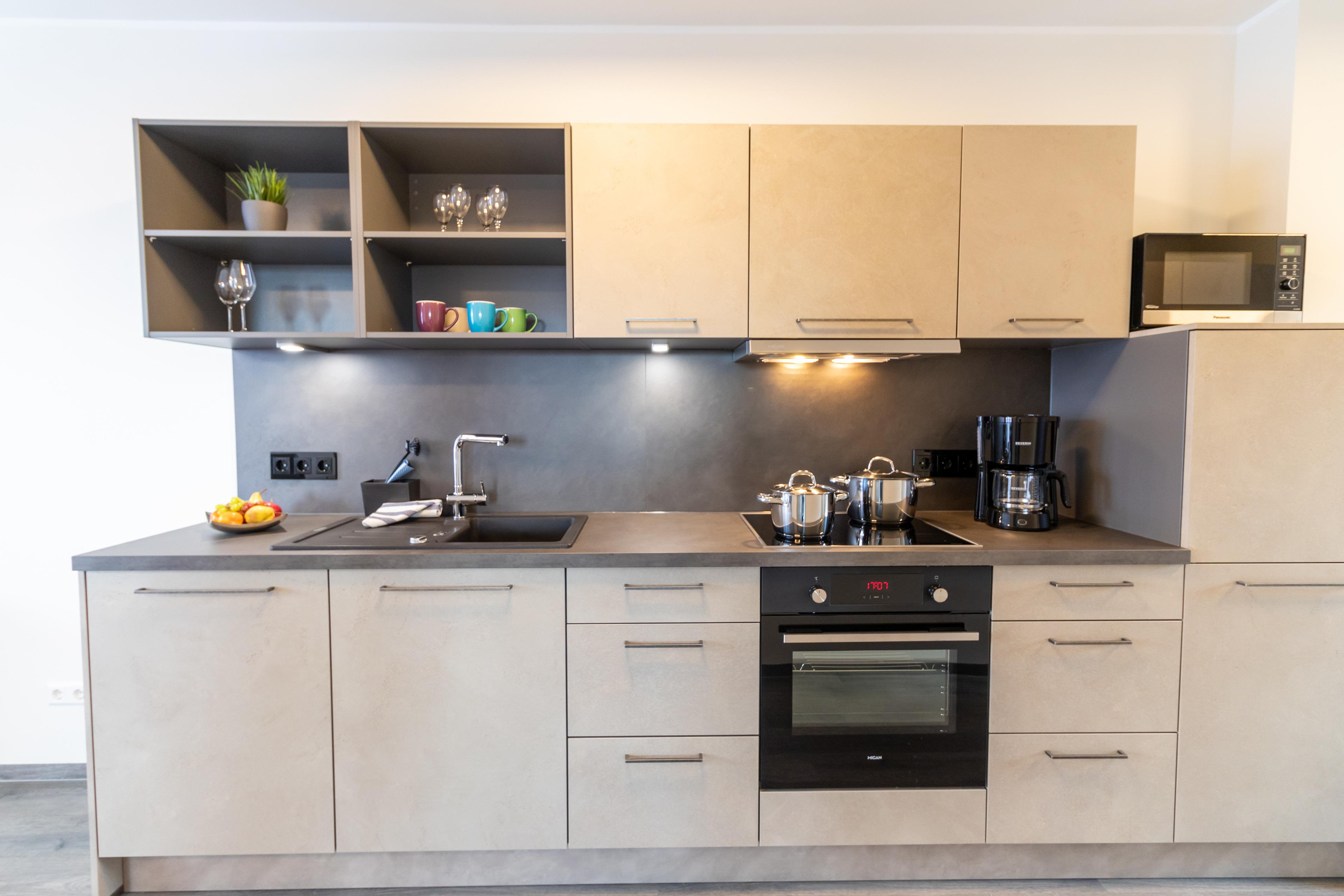 Backofen, Induktionsherd, Taschenfedernkernmatratze mit Härtegradwahl und Topper.