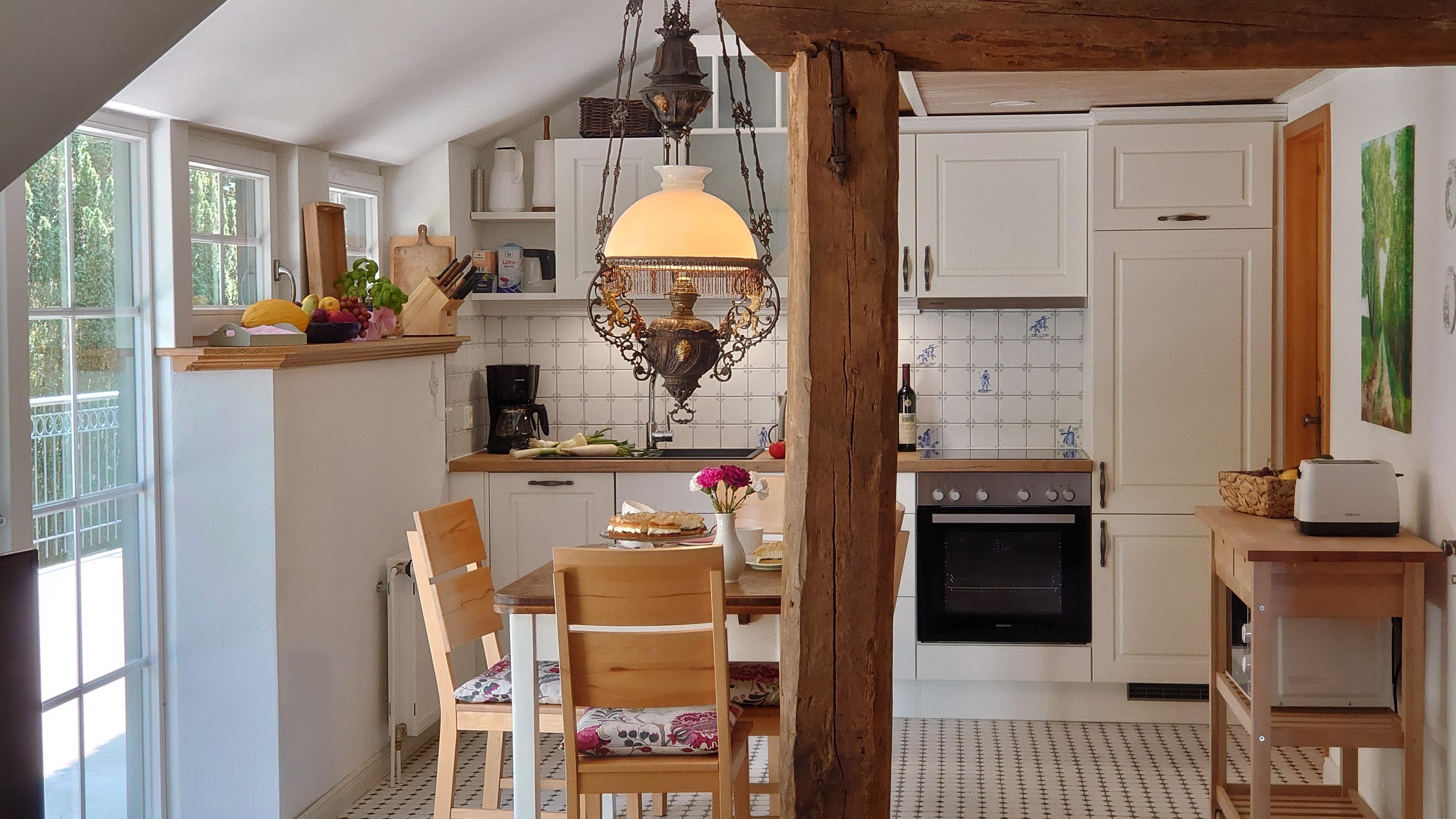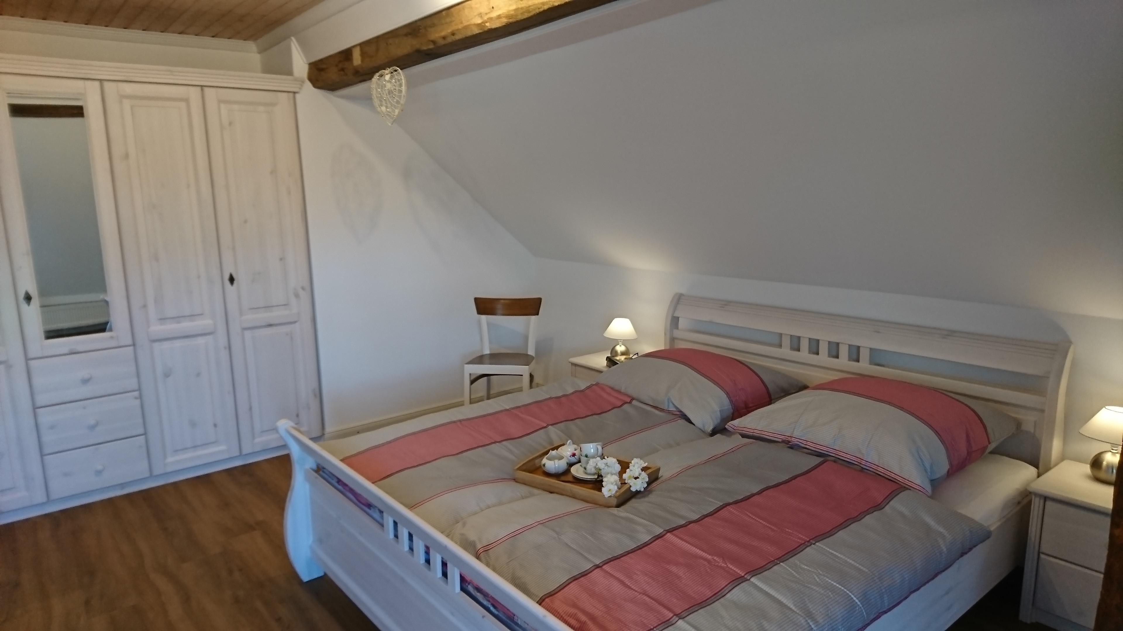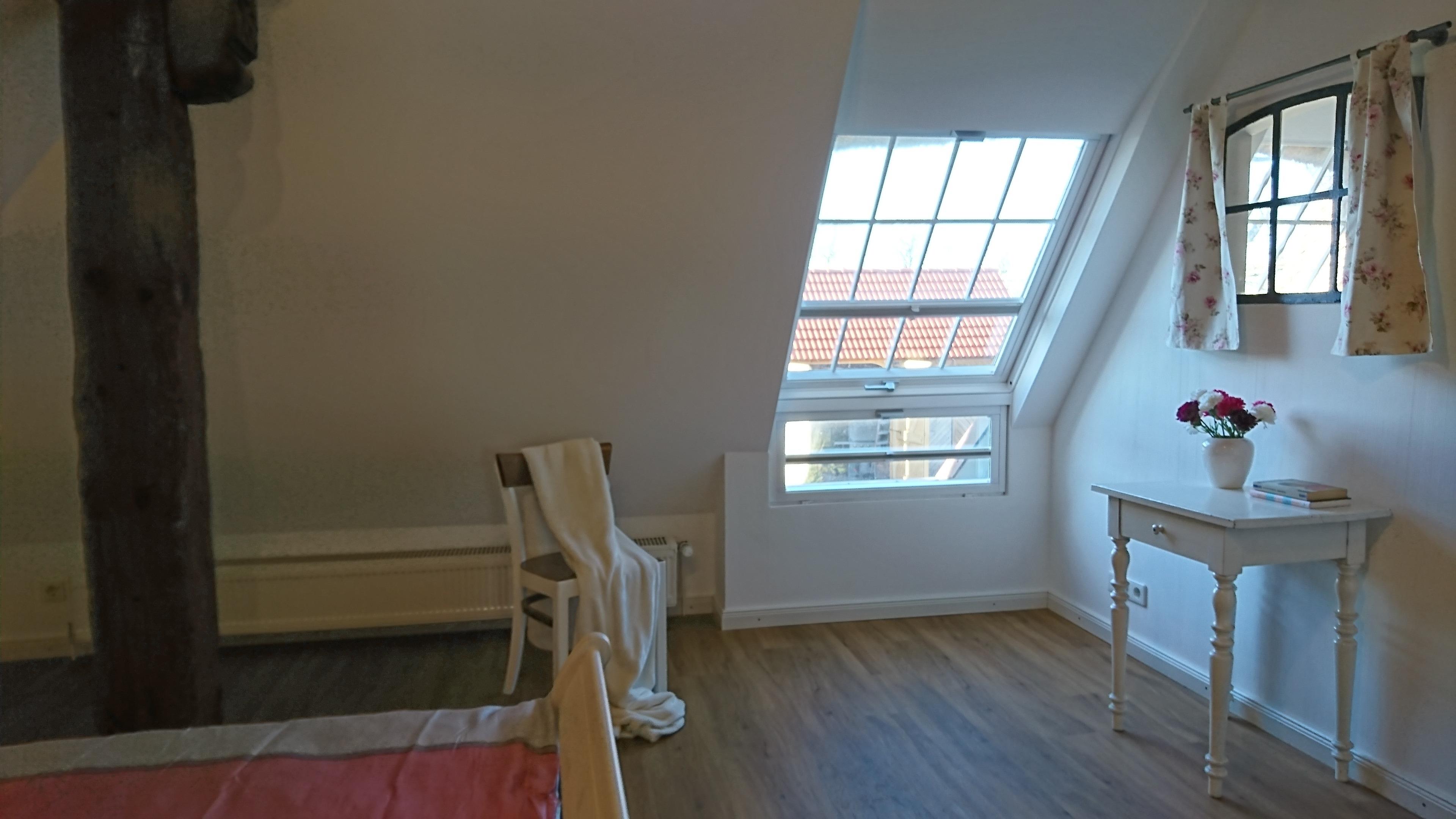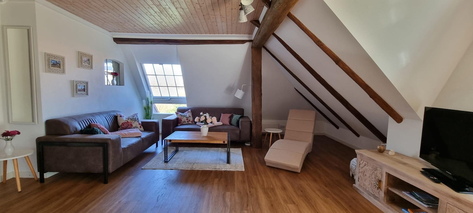 Wohnung 2 - De Leev: Romantische, gemütliche Ferienwohnung für frisch- oder immer noch Verliebte mit oder ohne Kleinkind für max. 3 Personen im 1. OG mit ca. 55 m² mit Blick auf den rückwärtigen Garten, Felder und einer großen Dachterrasse.