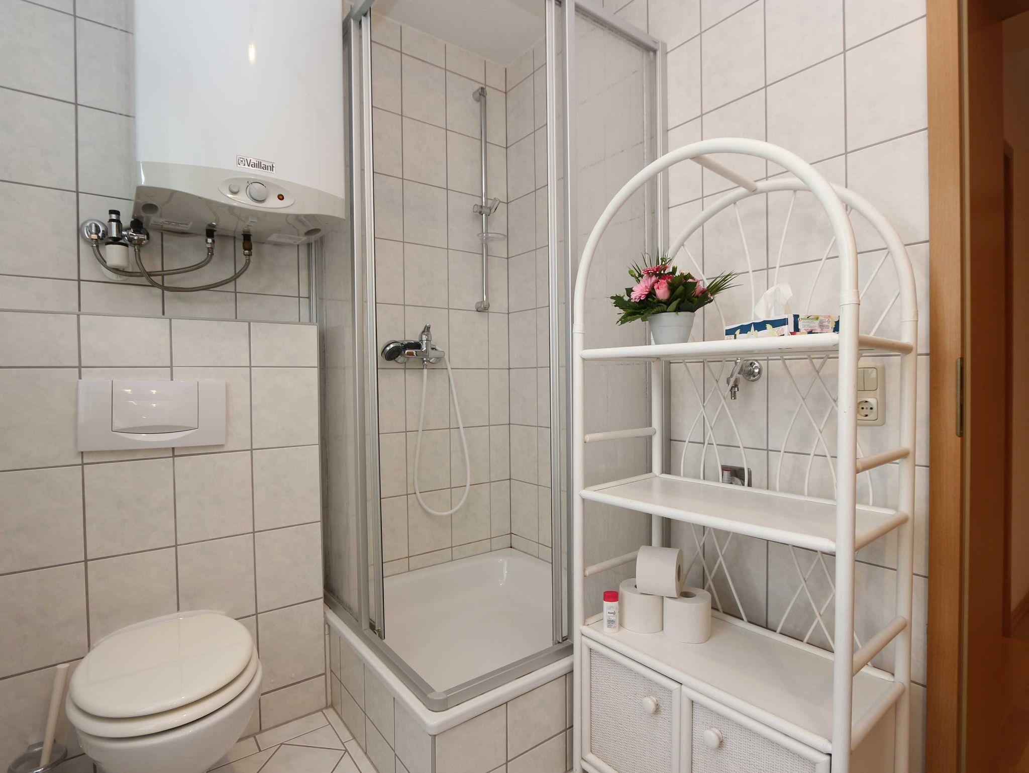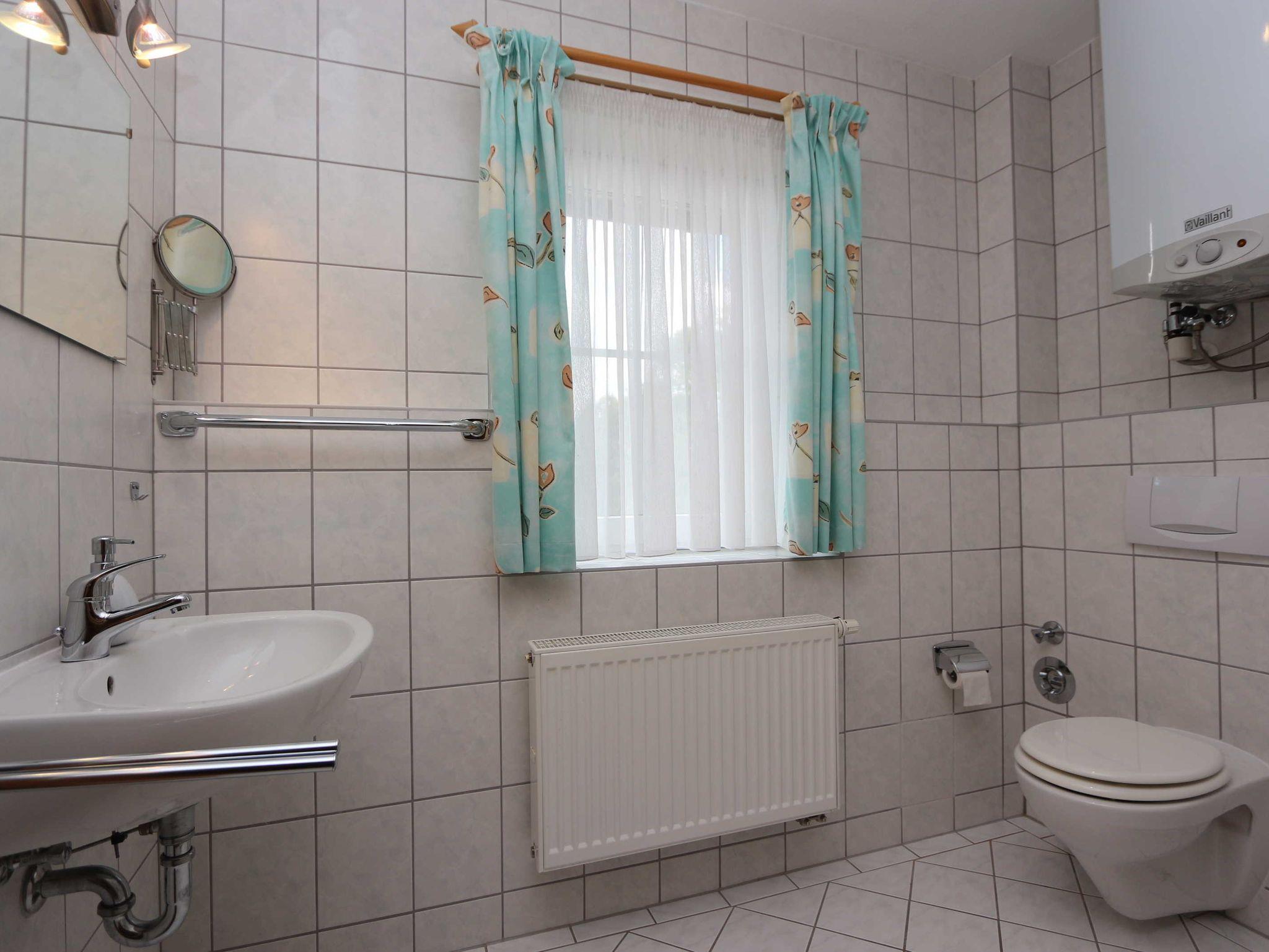 • Bad mit Fenster, Dusche, Waschbecken, WC, reichlich Ablagefläche und Haarfön.