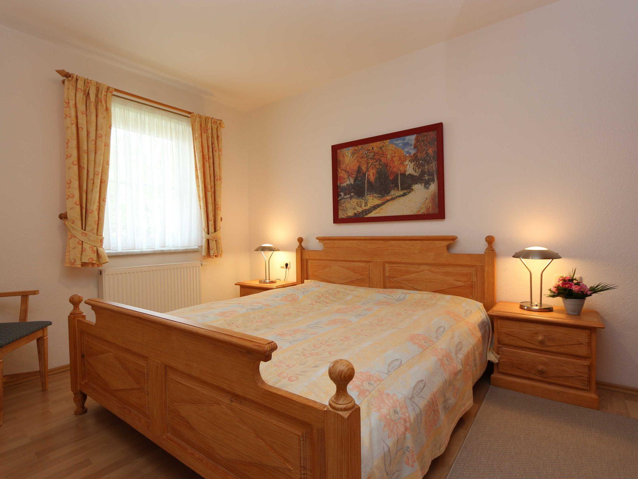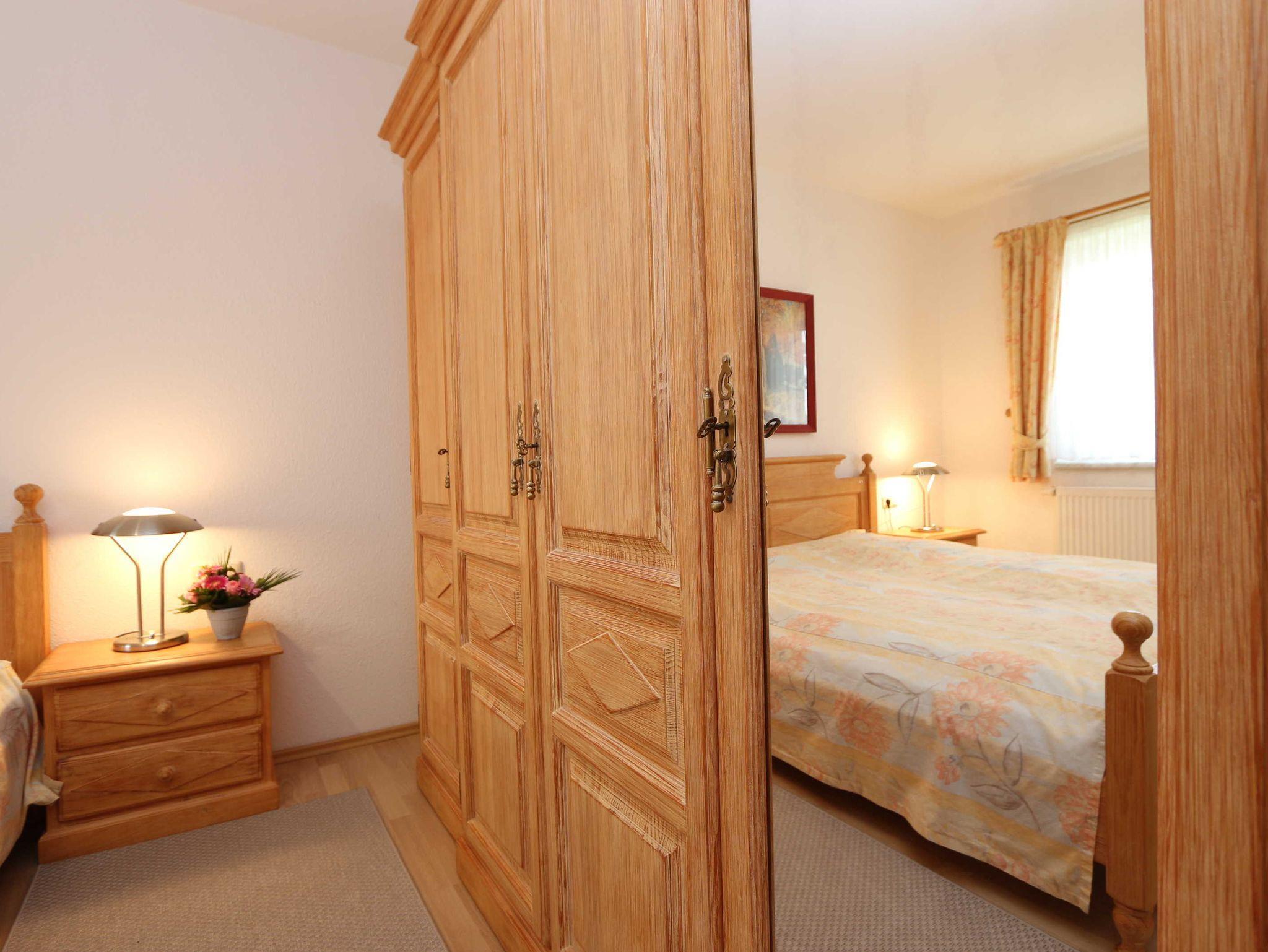 • Schlafzimmer mit einem Doppelbett (1,80 x 2,00m), Kleiderschrank, Spiegel und Anrichte.