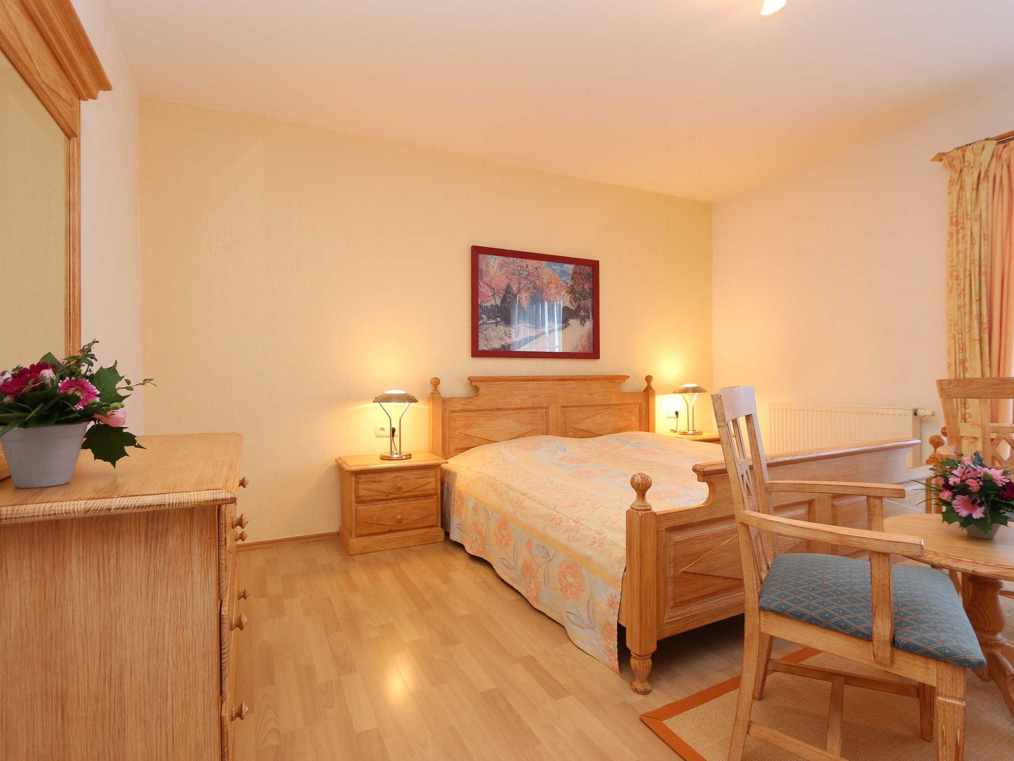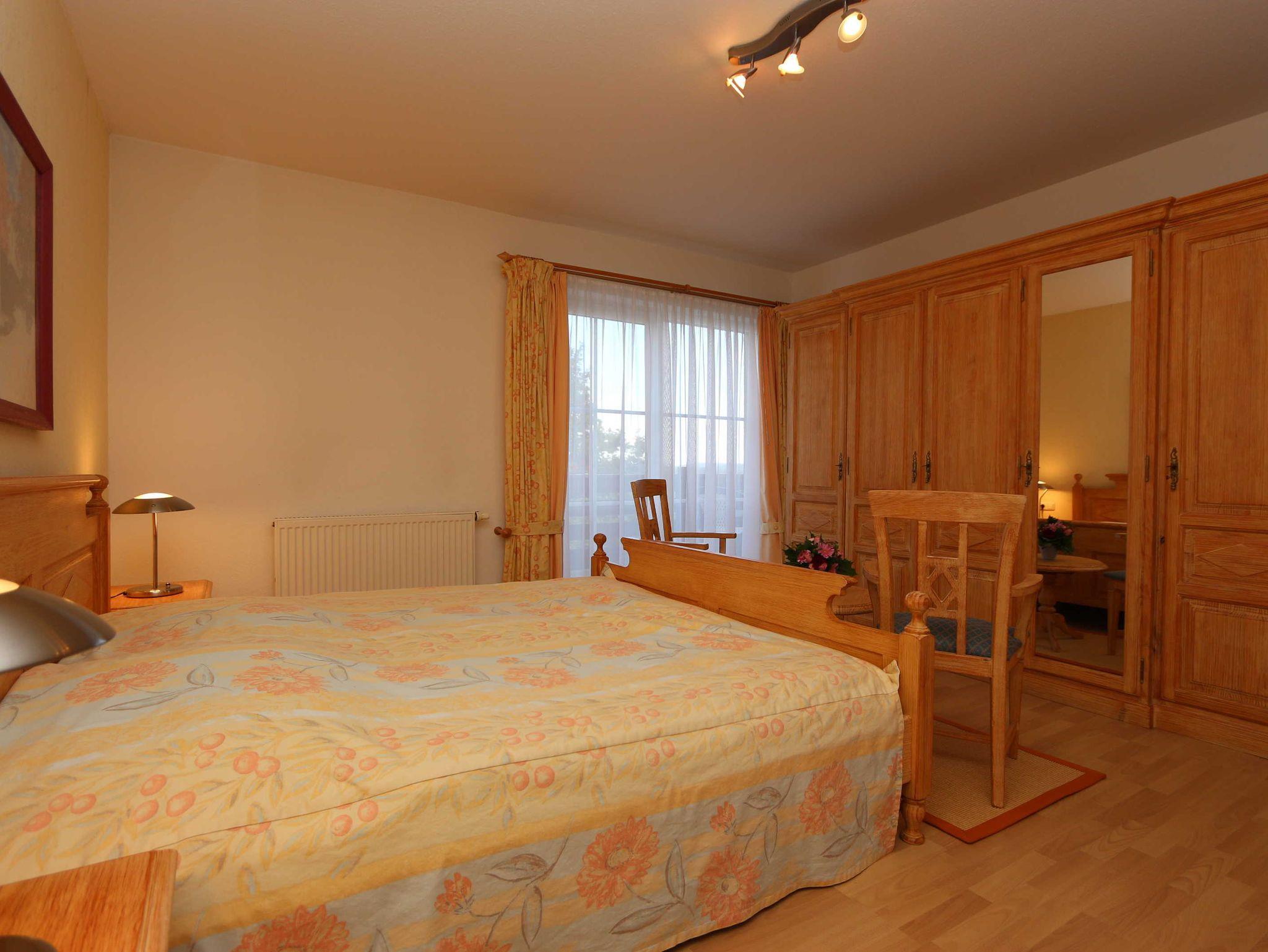 • Schlafzimmer mit einem Doppelbett (1,80 x 2,00m), Kleiderschrank, Spiegel und Anrichte.