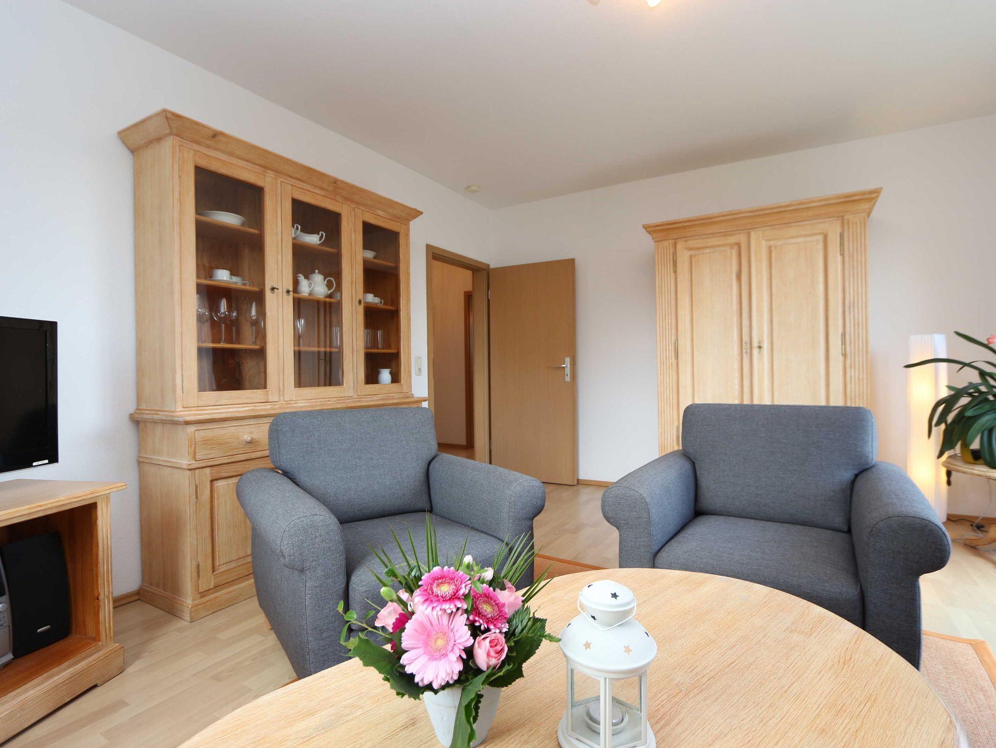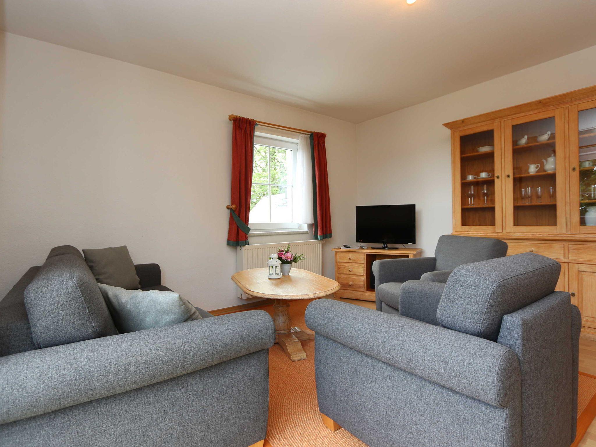 • Wohnzimmer mit Schlafsofa und 2 Sesseln, Flachbildfernseher, CD-Player.