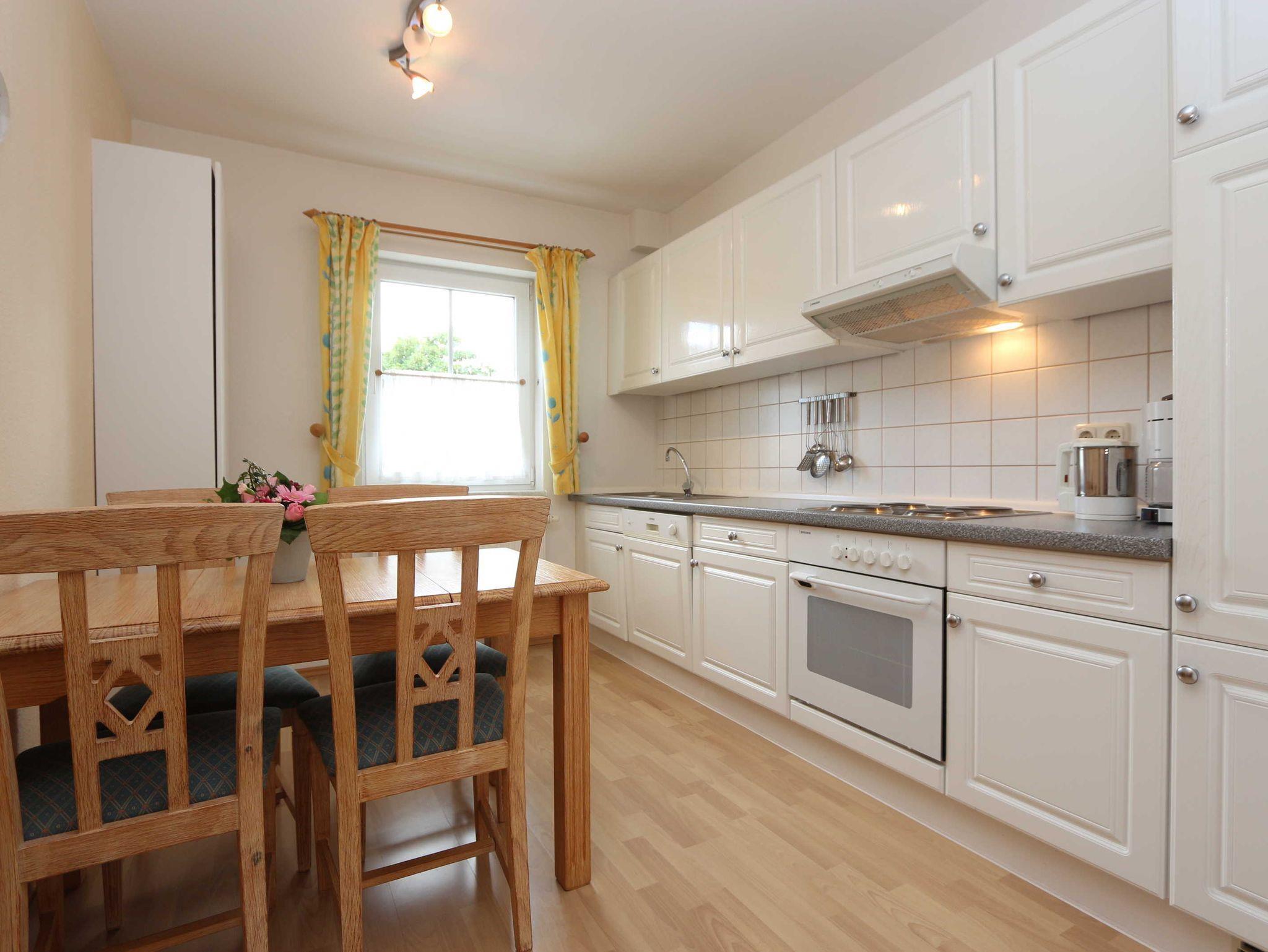 • Küche mit EBK und 4-Platten-Kochfeld, Herd, Spülmaschine, Kühlschrank mit Gefrierfach, Wasserkocher, Kaffeemaschine, Toaster, Mixer und ausreichend Geschirr und einem Essplatz für 4 Personen.