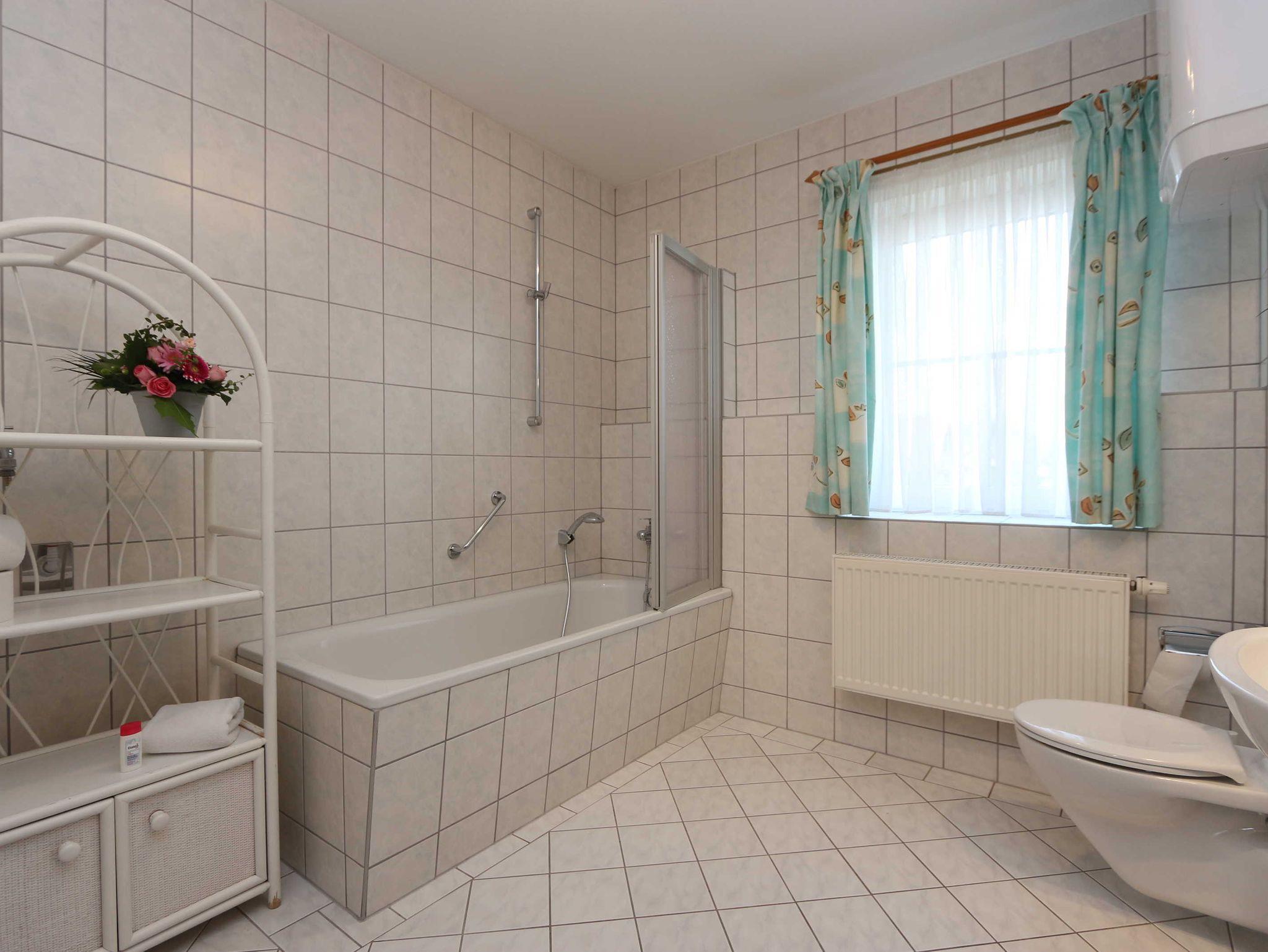 • Bad mit Fenster, Badwanne, Waschbecken, WC, reichlich Ablagefläche und Haarfön.