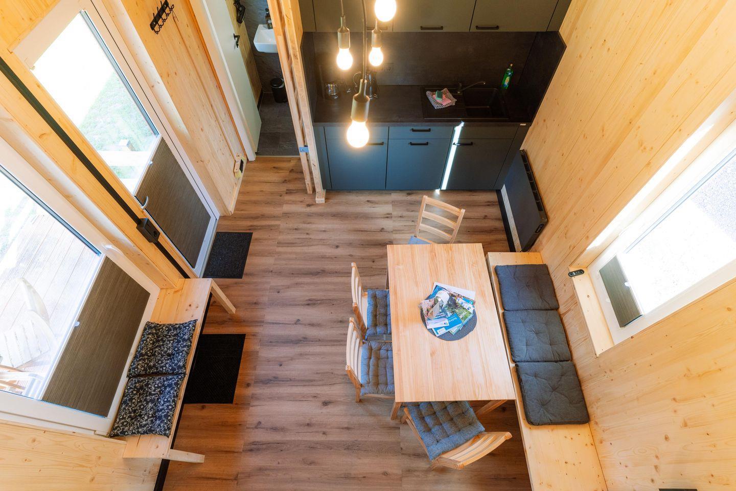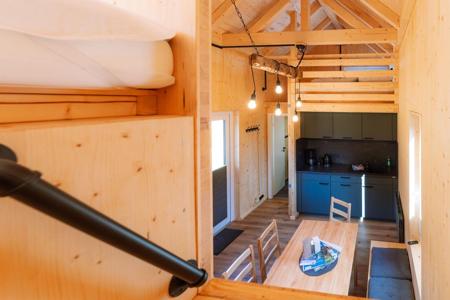 Das Tinyhouse bietet auf 25?m² einen offen gestalteten Wohnbereich mit Essplatz und voll ausgestatteter Küche. Zur Ausstattung gehören: zwei mobile Induktionsherdplatten, Kühlschrank, Kaffeemaschine, Wasserkocher, Toaster, Geschirr, Küchenutensilien und Geschirrtücher. WLAN ist kostenlos verfügbar.