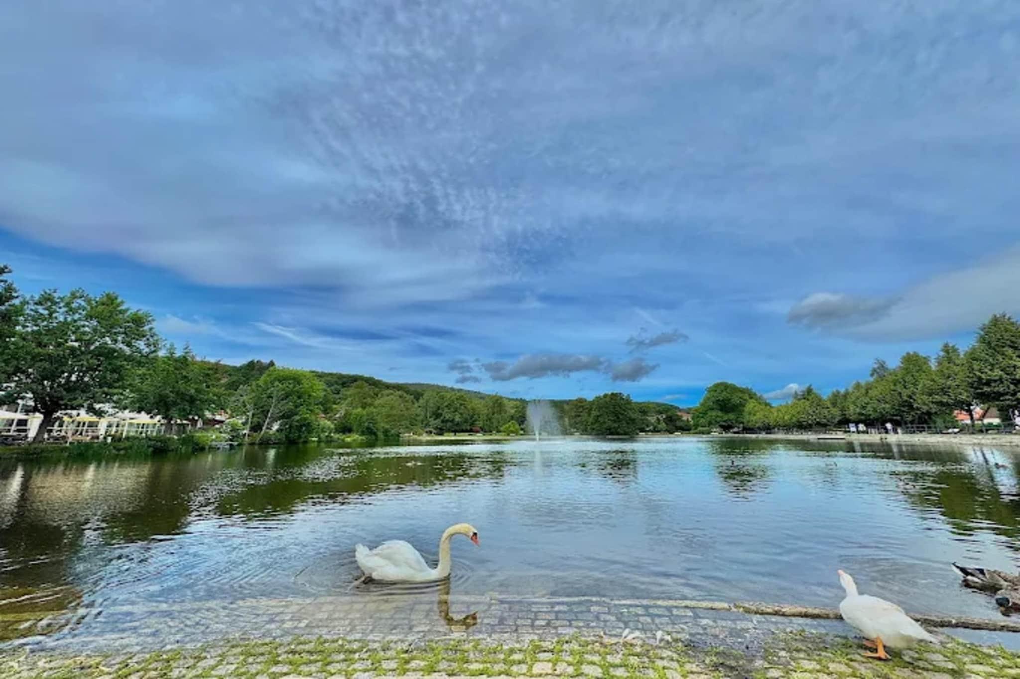 Denne koselige leiligheten i første etasje i Ilsenburg er perfekt for familier som søker natur og komfort. Bare 600 meter fra sentrum og omgitt av skog, er det en ideell base for å utforske Harz-regionen. Nærliggende attraksjoner inkluderer det majestetiske Brocken-toppen, den romantiske Ilse-dalen og det historiske Wernigerode-slottet. For kulturell sjarm byr Kloster Ilsenburg og Luftfartsmuseet på fascinerende opplevelser. Leiligheten har en romslig stue med satellitt-TV og radio, et stort kjøkken med moderne apparater og et familievennlig soverom med dobbeltseng og køyeseng. Badet har badekar med dusj, og sentralvarme sørger for helårskomfort. Utenfor kan du nyte en felles hage med lekeapparater, trampoline, sandkasse, kullgrill og hagemøbler. Sykkeloppbevaring og parkering på stedet gir ekstra bekvemmelighet. Omgitt av skogsstier og kun 100 meter fra et offentlig svømmebasseng, er beliggenheten perfekt for utendørseventyr. Spisesteder i nærheten inkluderer rustikke favoritter som Zur Waldschanke, fersk sjømat på Mullers Fisch und Speisegaststatte og italienske herligheter på Pizza Italia.