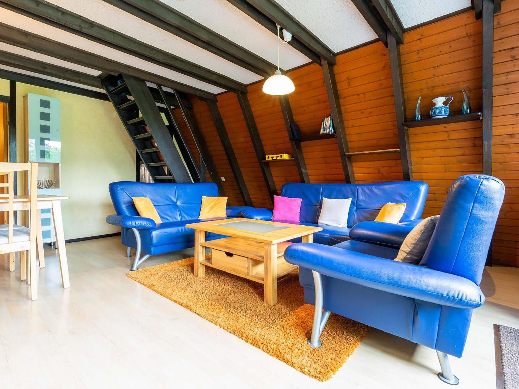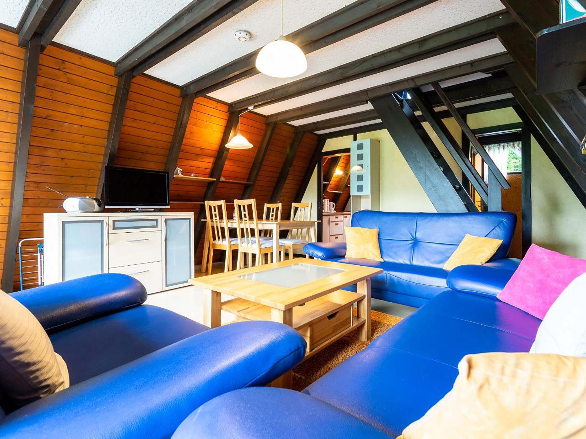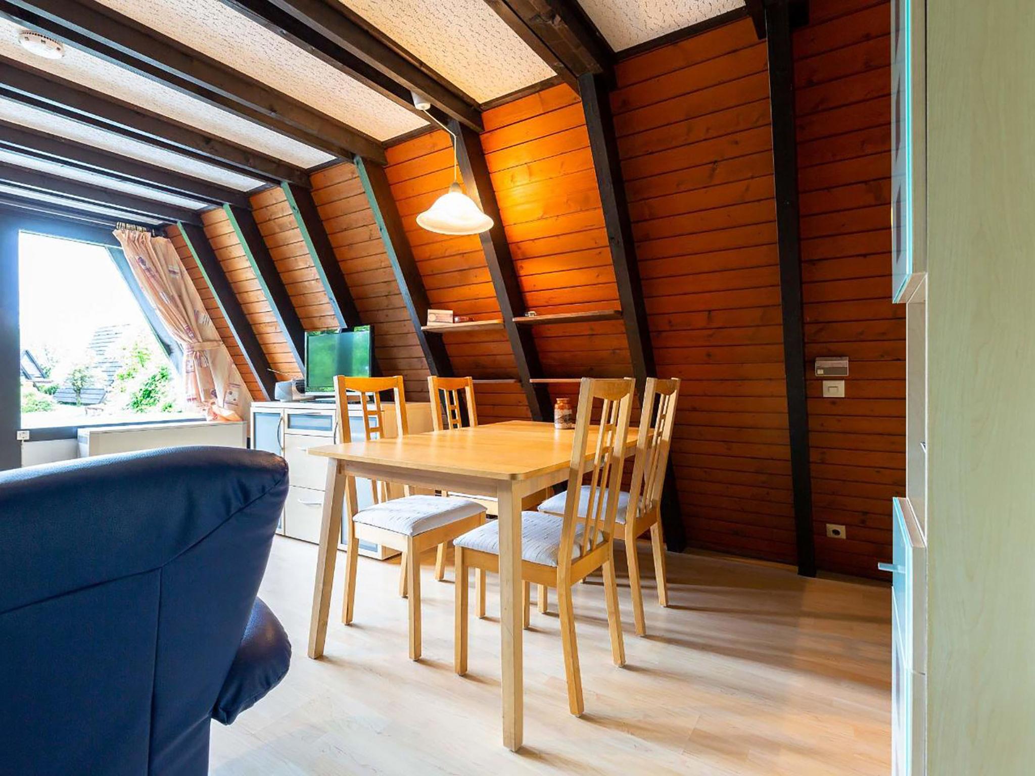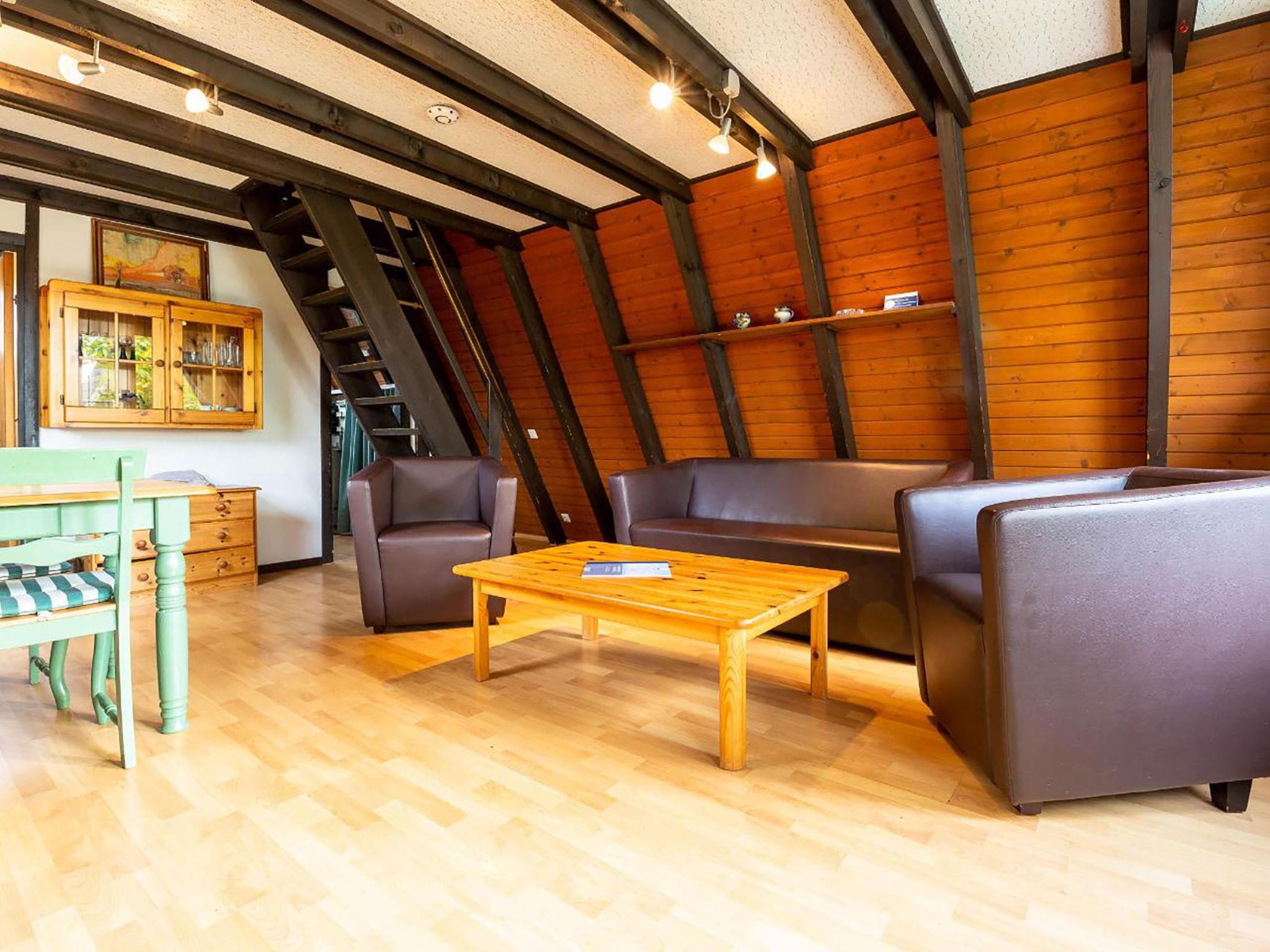 3-room house 50 m2 on 2 levels, on the ground floor. With sloping ceilings: living/dining room with satellite TV and radio. Exit to the garden, to the terrace. With sloping ceilings, open kitchen (2 hot plates, electric coffee machine). Shower/WC. Top floor: (steep stair), 2 rooms with sloping ceilings, each room with 2 beds. Electric heating. Terrace furniture. Facilities: Internet (WiFi, free). Please note: non-smoking house. Maximum 1 small pet/ dog allowed. A-frame house in wood construction.