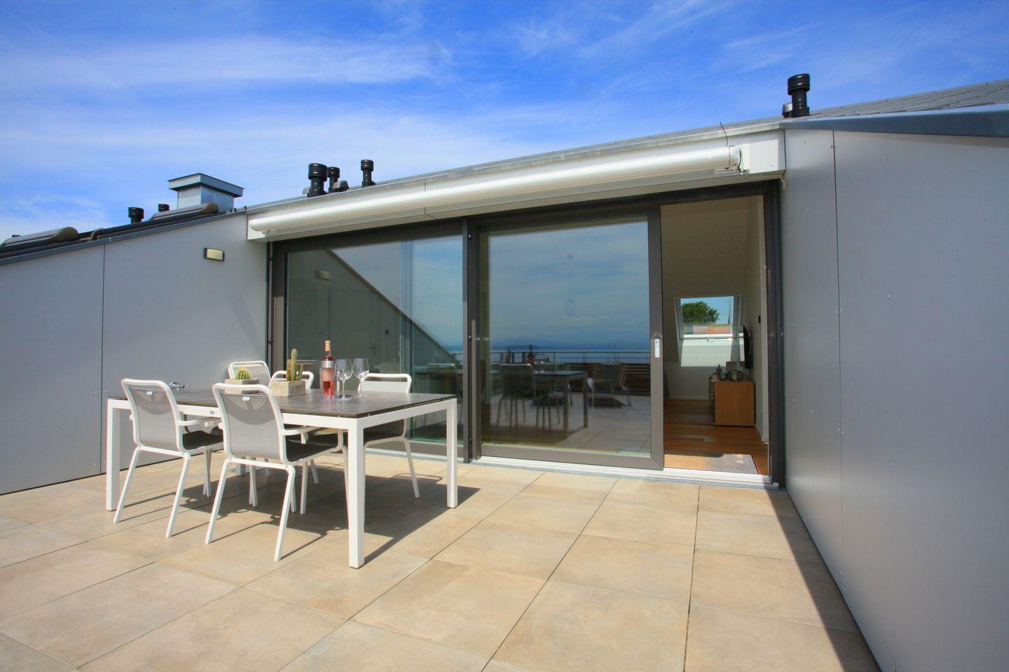 Das absolute Highlight der Ferienwohnung ist die 39 m² große Dachterrasse. Sie lädt mit zwei Liegen, einem Esstisch und Stühlen zum Entspannen ein. Eine große Markise sorgt für angenehme Beschattung, sodass Sie die spektakuläre Aussicht in vollen Zügen genießen können.