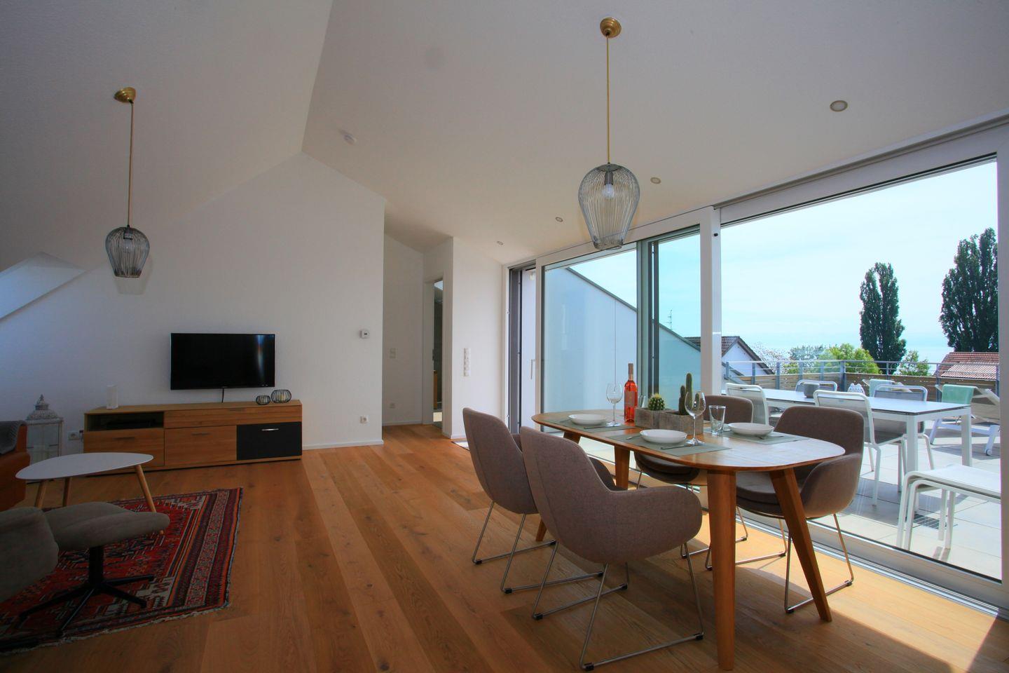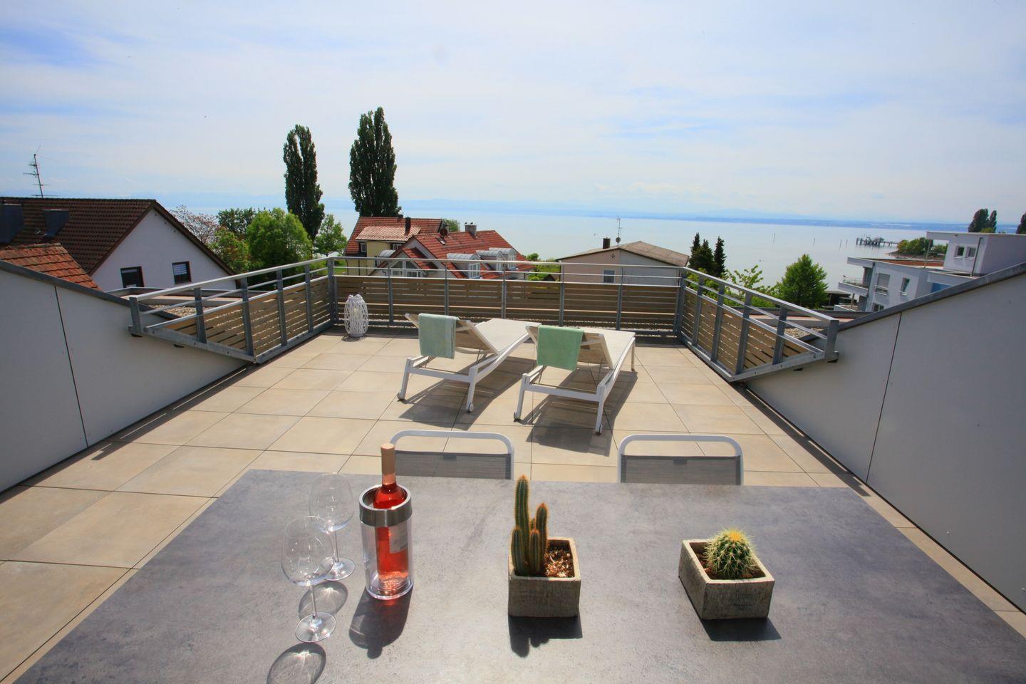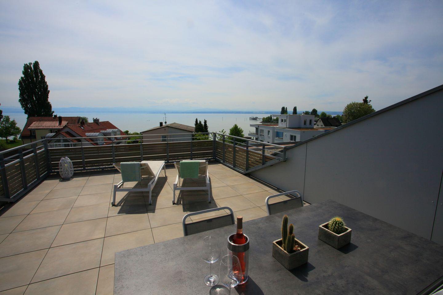 Genießen Sie unvergessliche Urlaubstage in dieser exklusiven Wohnung mit einer beeindruckenden Dachterrasse, die Ihnen von morgens bis abends einen atemberaubenden Blick auf den Bodensee und die Alpen bietet. Der See und der kostenlose Strand sind nur wenige Schritte entfernt, ebenso wie Geschäfte und Restaurants.