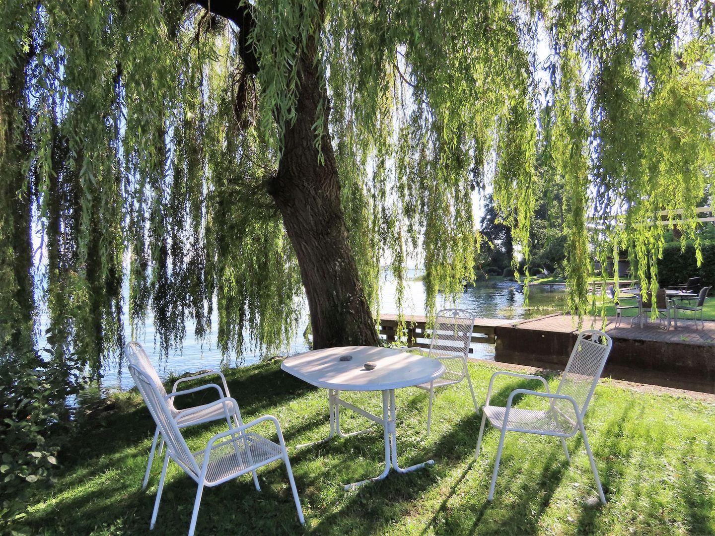 Das absolute Highlight: Der private Garten mit eigenem Seezugang. Hier können Sie ungestört direkt am See bei traumhafter Kulisse entspannen und die Seele baumeln lassen.