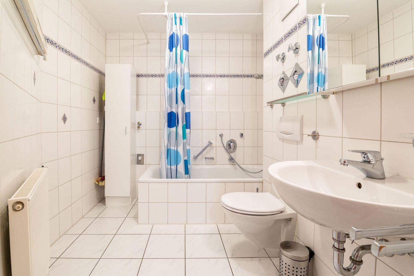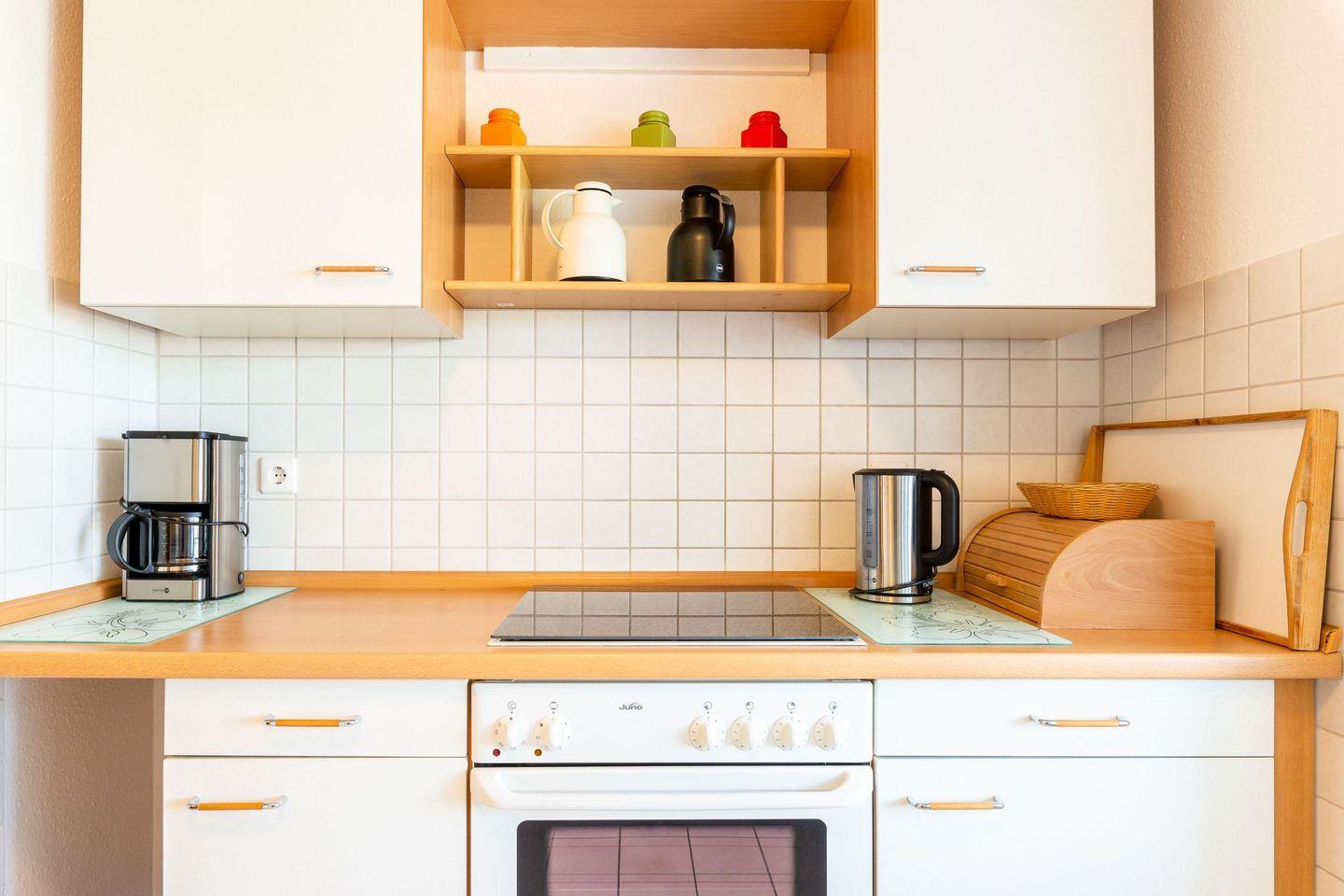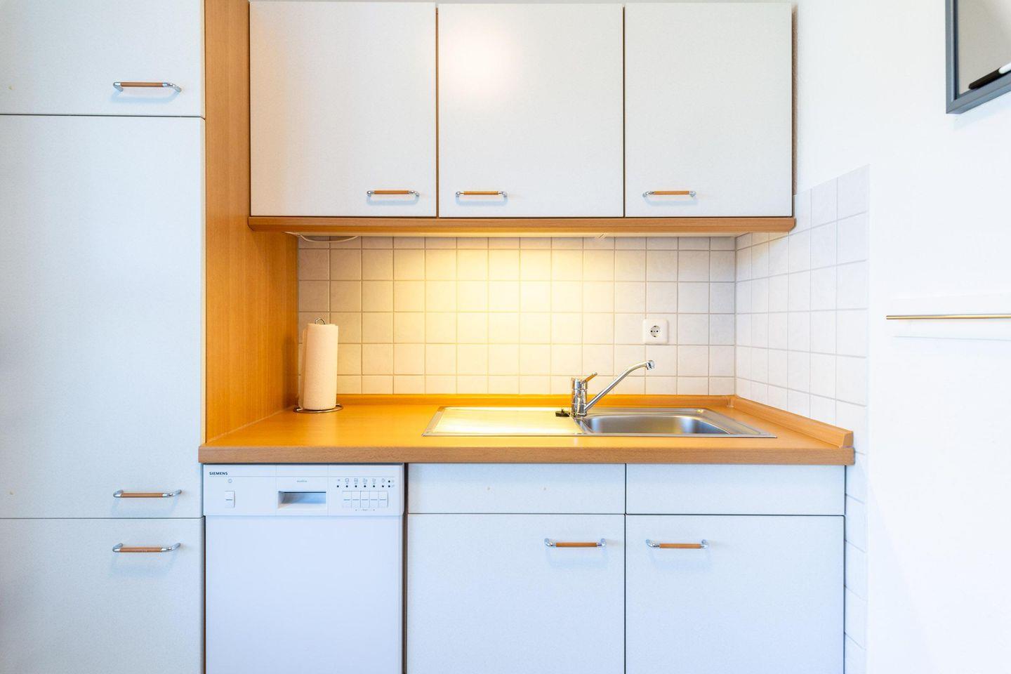 Genießen Sie die Annehmlichkeiten einer voll ausgestatteten Küche mit Spülmaschine und Balkon mit Blick ins Grüne. Auch WLAN und ein privater Parkplatz in der Tiefgarage sind vorhanden.