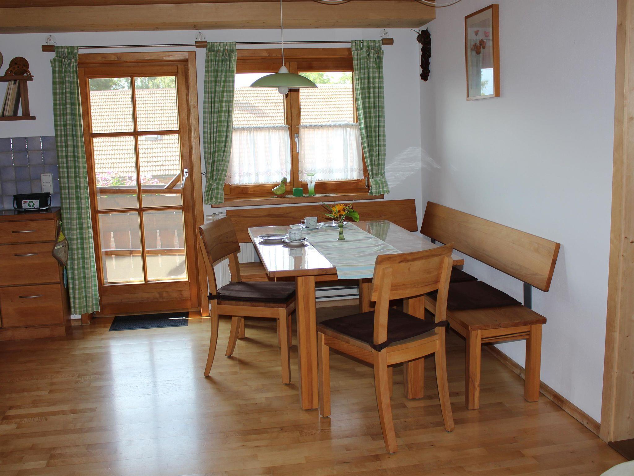 Sehr gemütliche Wohnung, mit 2 Schlafzimmern in Landhausstil und in Altholz. 2 Bäder jeweils mit WC und Dusche. Parkettböden, Holzdecken, Fussbodenheizung in einem Bad, großer Balkon, sep. Eingang für die Fewo´s, Fliegengitter, Toaster, Eierkocher, Kaffeemasch., Wasserkocher, Stand.gewürze, Kinderspiele, Kinderbücher, Kleinkinderfahrzeuge (Traktor, Bobbycar, Dreirad, usw.) vorhanden, Kikerkasten und Tischtennisplatte, große Spiellandschaft mit Sandkasten und Schaukel, 2 gr. Gokards Grillplatz, 2 Liegestühle auf dem Bakon, Wasch.-u. Spülmasch. vorhanden viele Tiere (Katzen, Ochsen,Hasen, Hühner, Schafe, Ziegen, Esel, Enten) herrliche Berg-Panorama-Sicht, Wandermöglichkeit von der Ferienwohnung aus, 10 min Autofahrt zu zwei Seen. 20 min Autofahrt zum nächsten Skilift und Langlaufloipe, Rauchen nur auf Balkon.