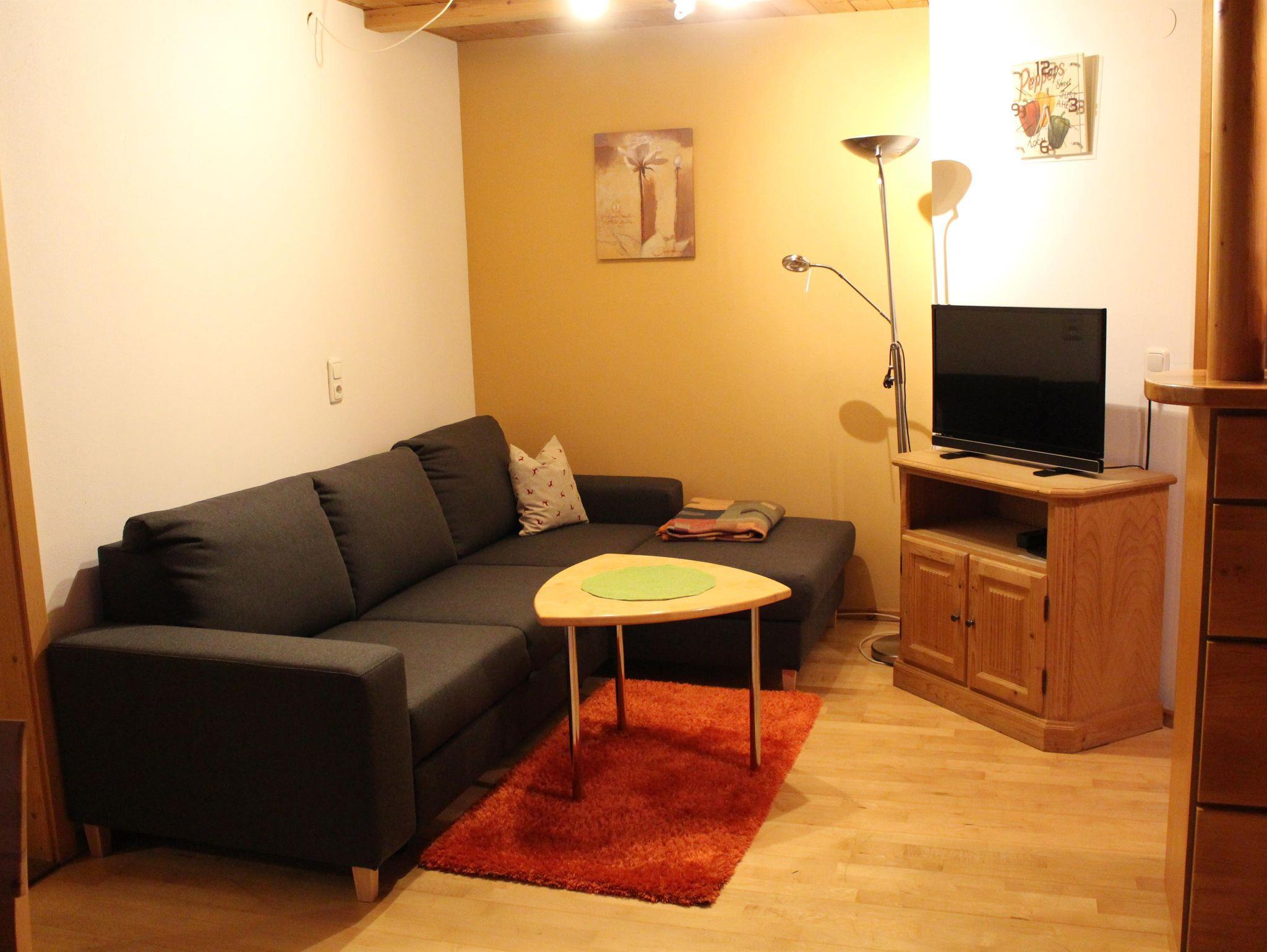 Ferienwohnung I (bis 5 Personen) enthält 2 Schlafzimmer (mit 2 Doppelbetten und 1 Einzelbett) und 2 Fernseher, moderne Wohnküche mit Couchgarnitur, 2 Bäder mit WC und Dusche und einen Südbalkon mit herrlicher Aussicht auf den Grünten.