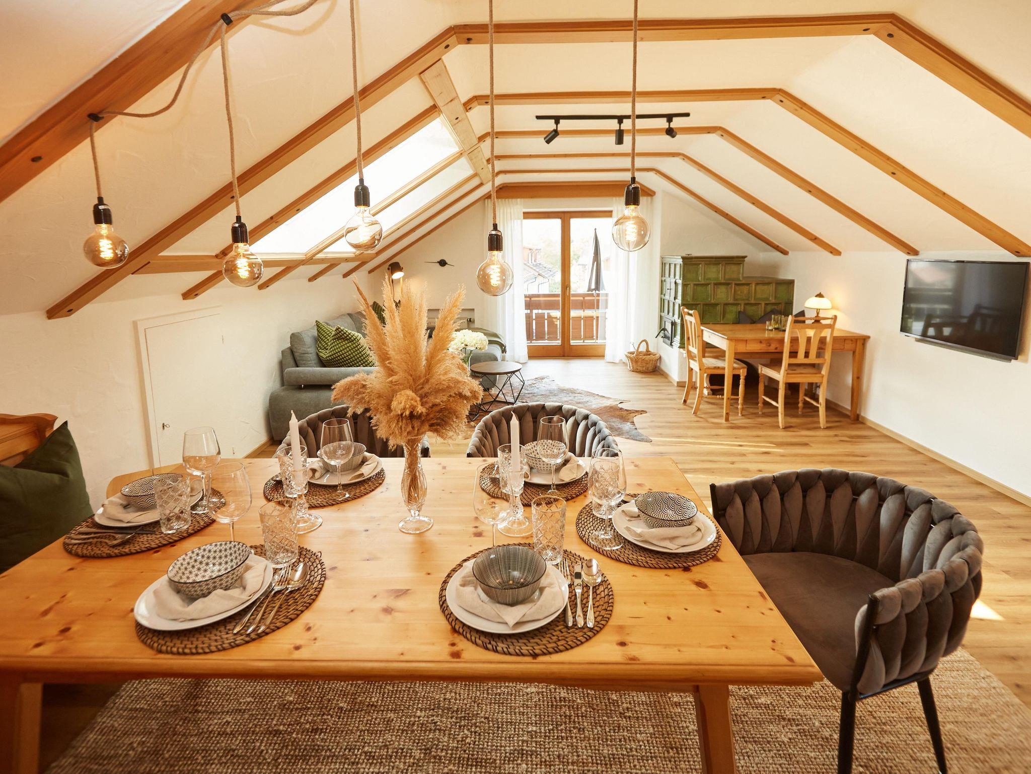 Die 90 m² große, im alpinen Lifestyle eingerichtete Dachgeschosswohnung bietet mit seinen zwei Schlafzimmern mit Kingsize Boxbetten und einer gemütlichen Couch Platz für bis zu vier Personen plus ein Kleinkind bis zu 3 Jahren, für welches wir auf Anfrage ein Reisebett und einen Hochstuhl gegen eine einmalige Gebür von 20,-€ zur Verfügung stellen.