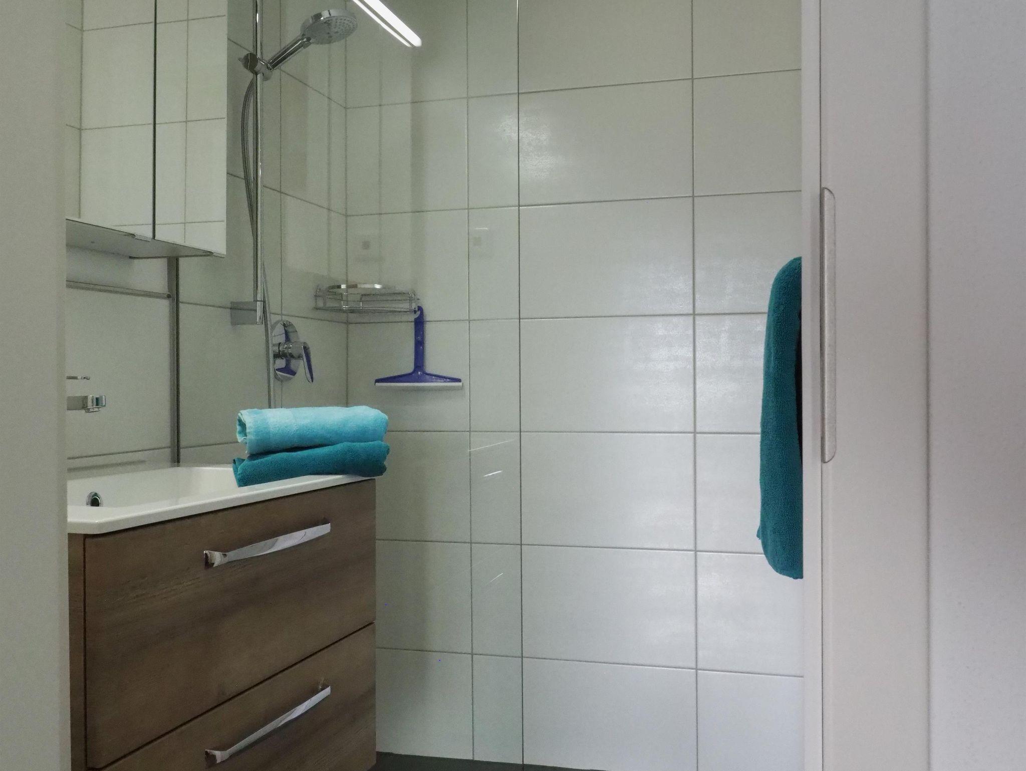 Das Badezimmer ist mit einer begehbaren Dusche und einem Einbauwaschbecken mit Spiegelschrank ausgestattet.