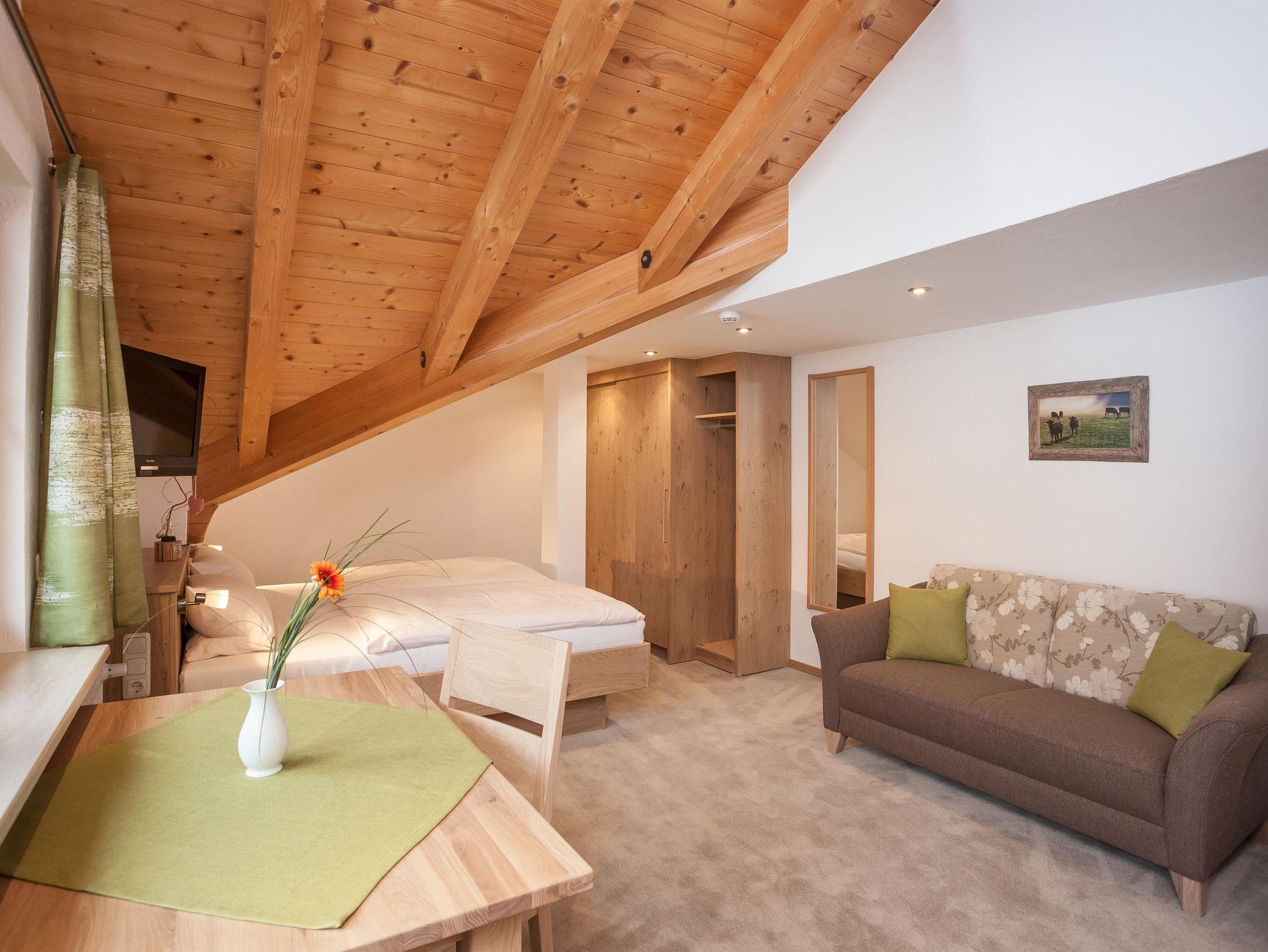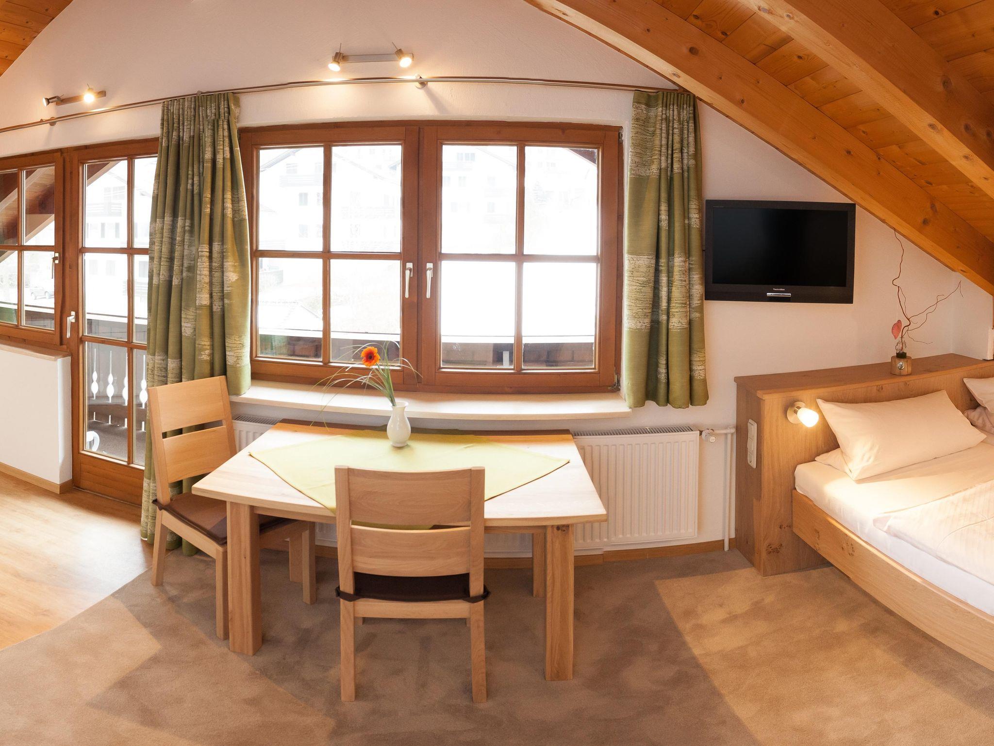 Die gemütliche Dachstudio-Ferienwohnung Hornblick hat einen sichtbaren Dachstuhl und verfügt über einen eigenen Südbalkon. Die Wohnung ist ausgestattet mit einem Wohn- / Schlafzimmer, Küchenzeile mit Spülmaschine, Essecke, TV und Bad mit Dusche und WC.