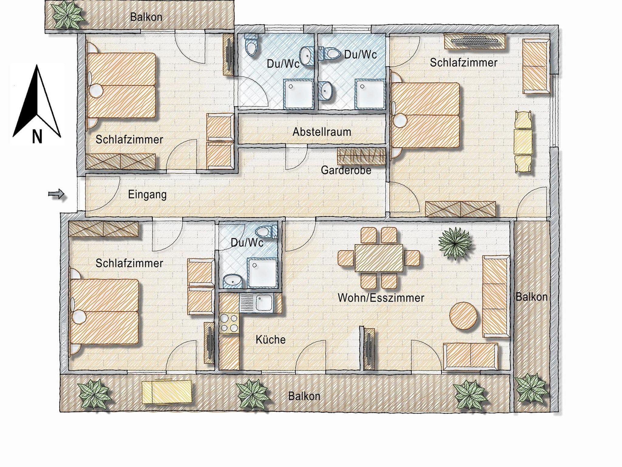 Die Ferienwohnung Nagelfluh bietet Platz für 3 bis 6 Personen und verfügt über einen großen Süd-, Ost- und Nordbalkon mit freiem Blick. Die Wohnung bietet drei Schlafzimmer mit jeweils eigener Dusche / WC, Balkon und TV. Das Wohn- und Esszimmer mit Küche hat zusätzlich einen Balkon und TV. Die Küche ist ausgestattet mit Spülmaschine, Backofen und Mikrowelle.