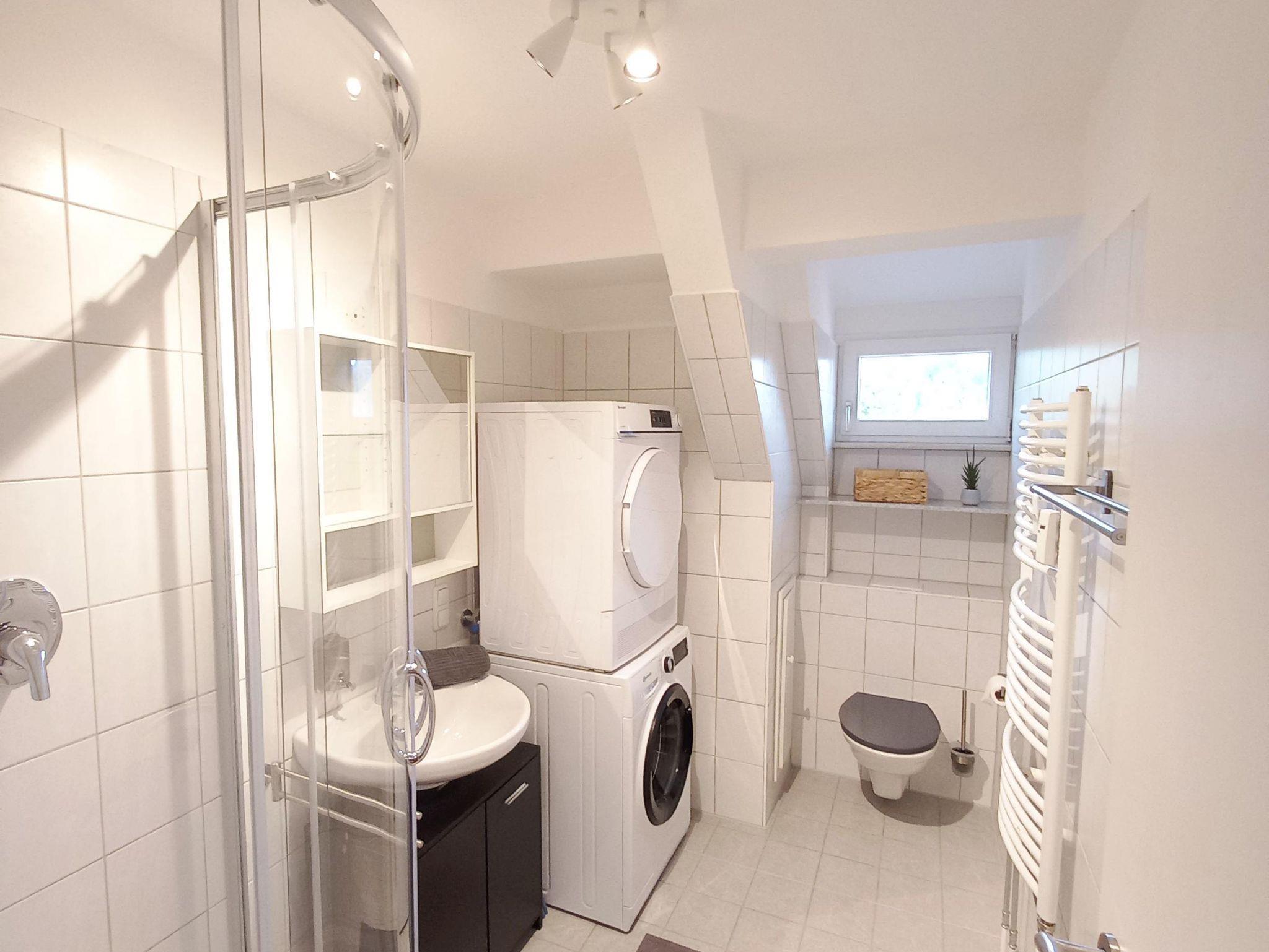 Badezimmer mit Fenster: Dusche, WC, Waschmaschine, Trockner, Haarföhn, kostenlose Pflegeprodukte