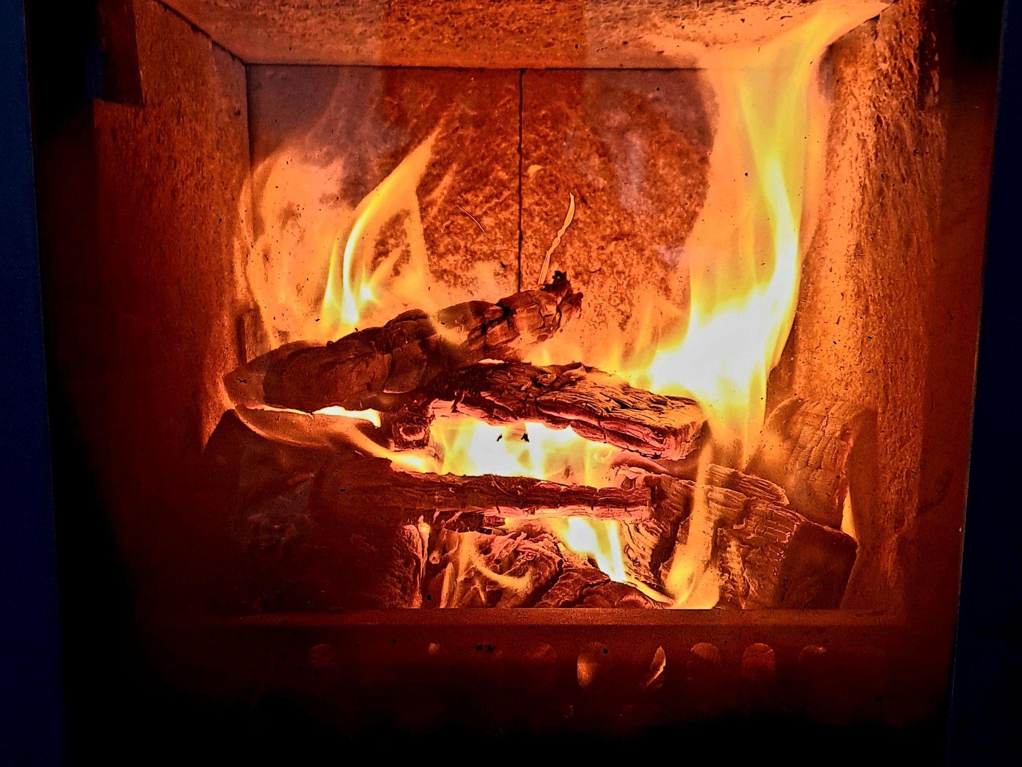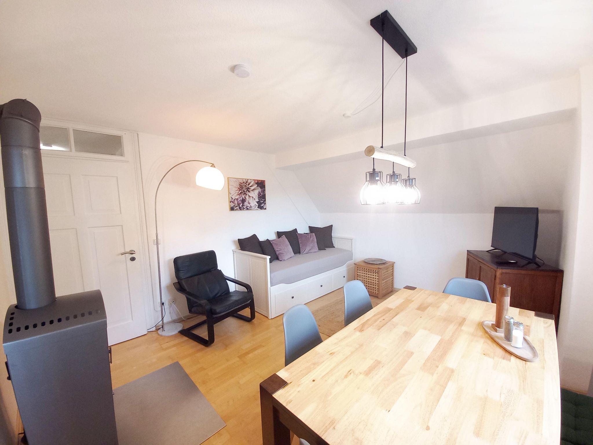 Wohnzimmer: Schwedenofen, Flachbild-TV, großer Esstisch und 6 Sitzgelegenheiten, ausziehbares Couchbett (mit richtigen Matratzen)