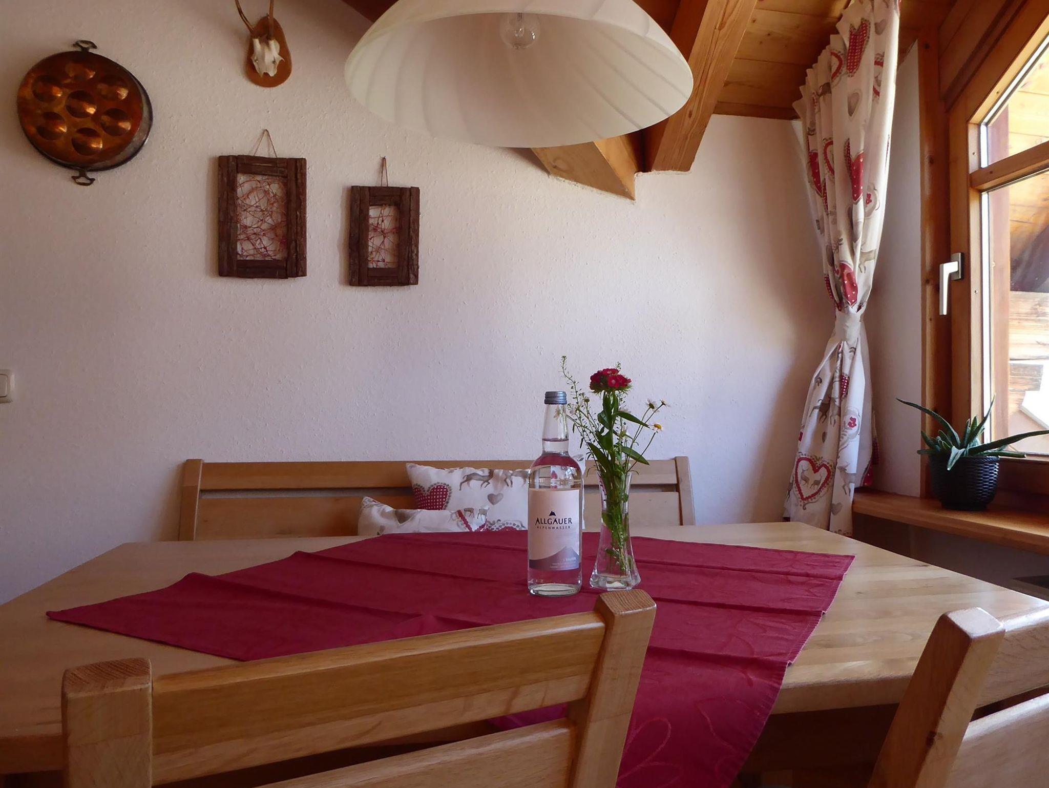 Die Wohnung Bauernstube für 2 Personen ist ca. 45 m² groß. Der Giebel mit dem großen Fenster nach Süden bringt viel Licht und den Blick auf unseren Hausberg, das Immenstädter Horn.
