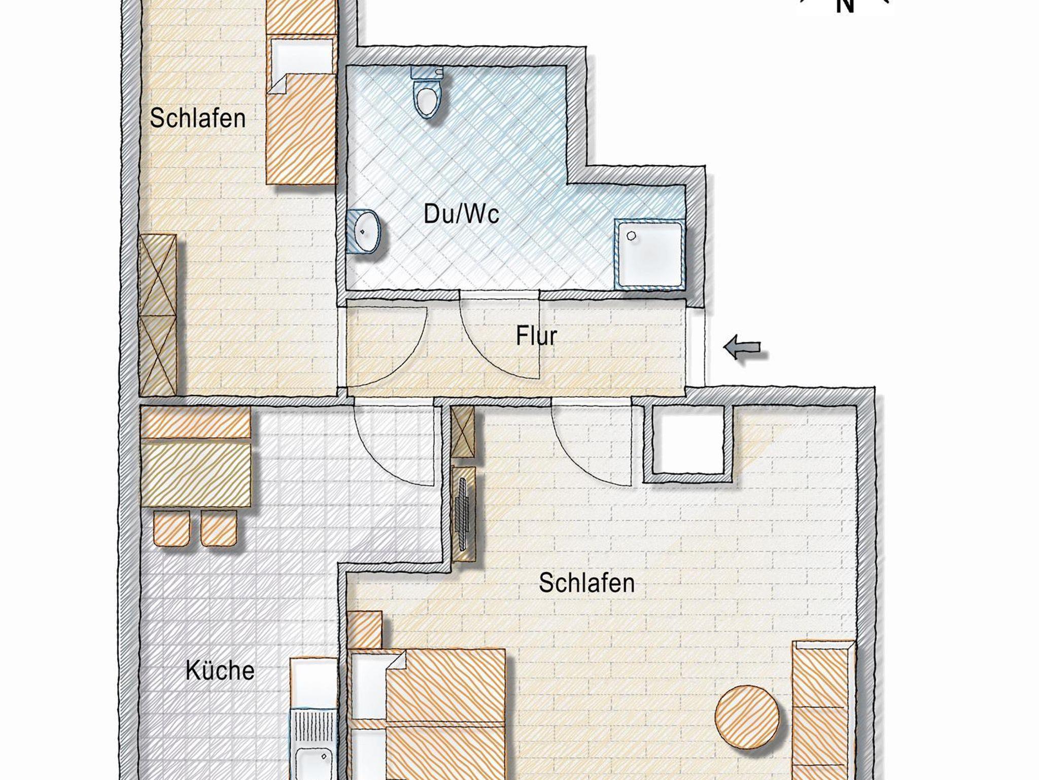 Diese Ferienwohnung ist nach Süden ausgerichtet und ist mit einem Wohn - Schlafzimmer, einem weiteren Schlafzimmer, einer Wohnküche mit Spülmaschine, Backofen, Mikrowelle, TV und Du/Wc ausgestattet.
