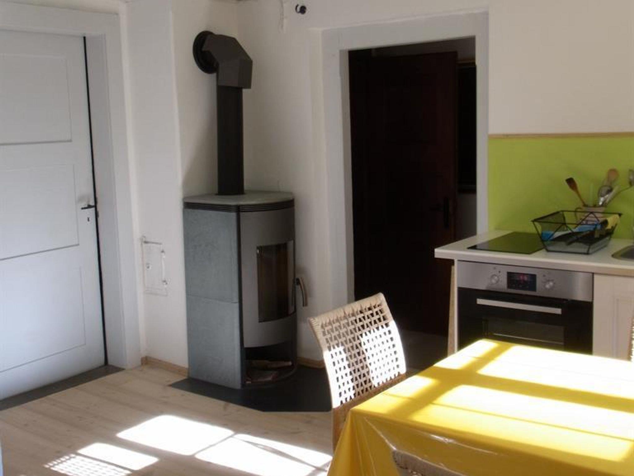 Die Wohnküche ist ausgestattet mit 2-Platten Induktionsherd mit Backröhre, Spülbecken mit Untertischboiler, Kühlschrank mit Gefrierfach, Spülmaschine, Wasserkocher. Wärme spendet ein gemütlicher Holzofen mit Feuersichtfenster. In der Wohnküche steht ein kleines Sitzsofa sowie ein Tisch mit Stühlen.