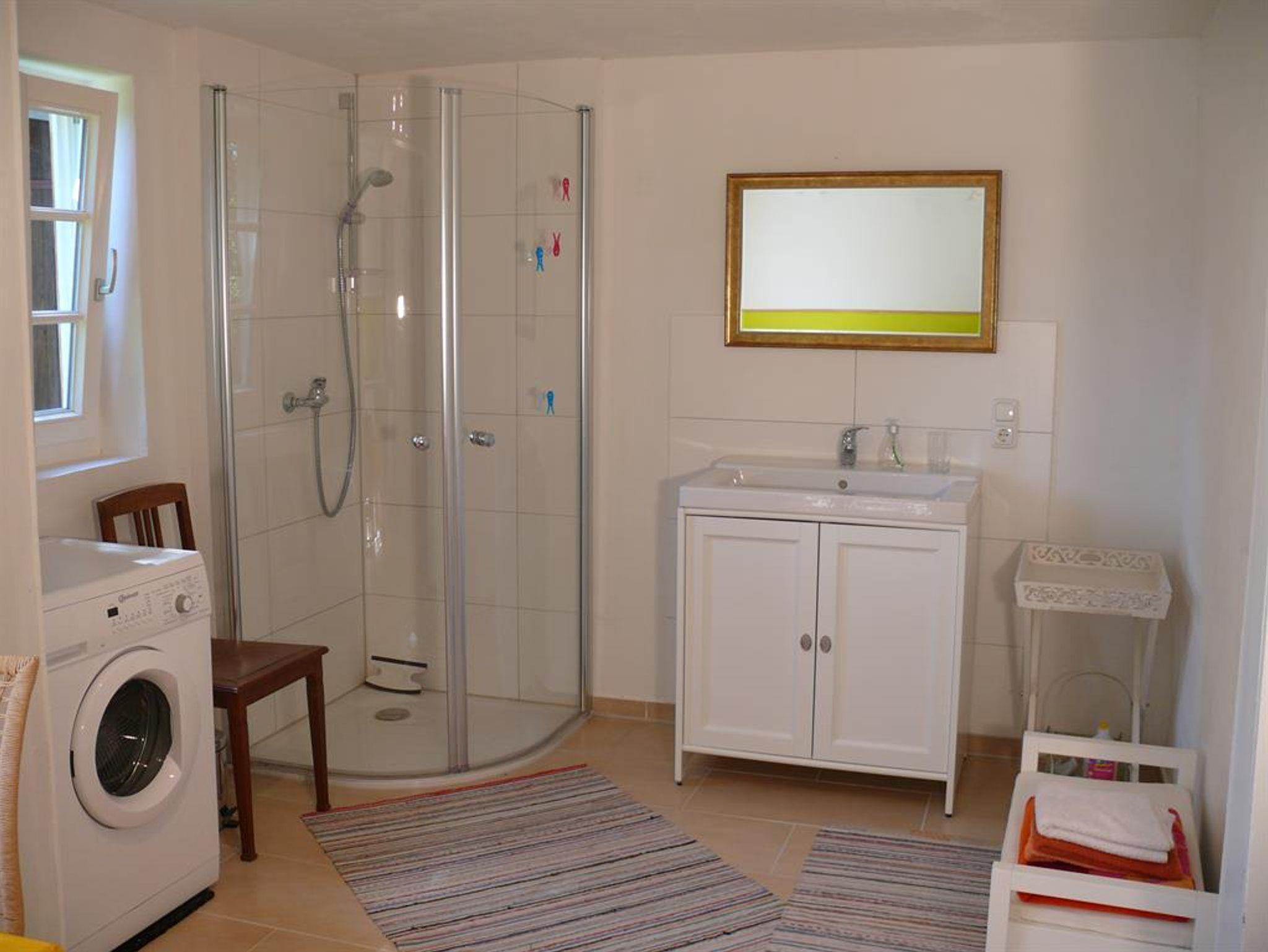 Das geräumige Badezimmer enthält Dusche, Waschbecken, Waschmaschine und eine kleine Bank mit Truhe als Sitz- und Ablagemöglichkeit.