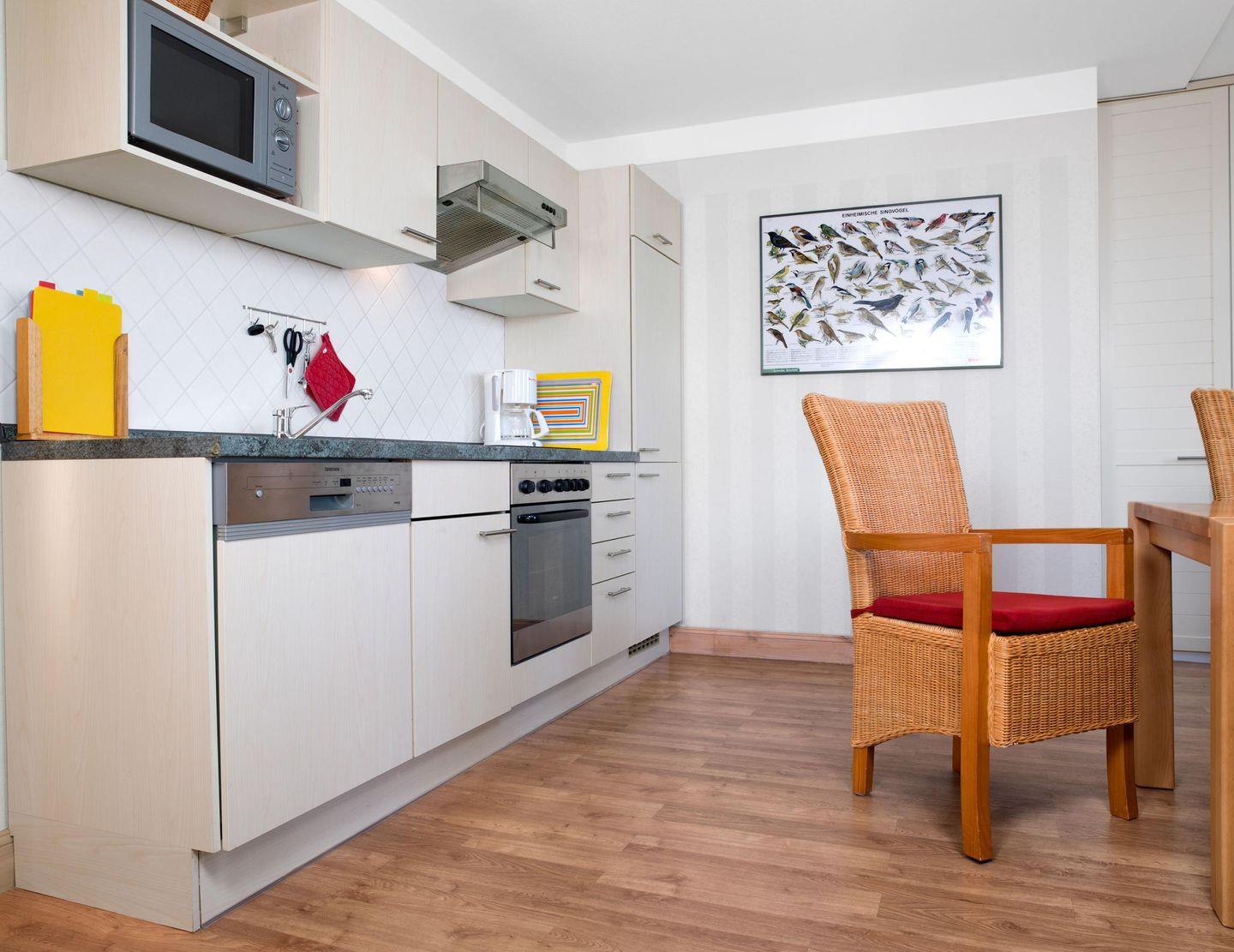 Die Küche ist komplett ausgestattet (Geschirrspüler, Mikrowelle, Herd mit Backofen, Kaffeemaschine, Espressomaschine) und haben eine gemütliche Sitzecke mit Blick auf die Kirchsee.