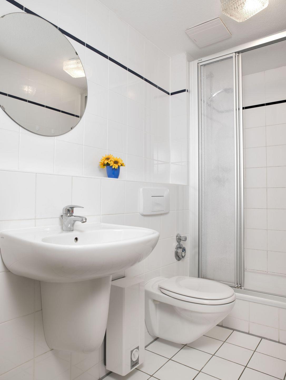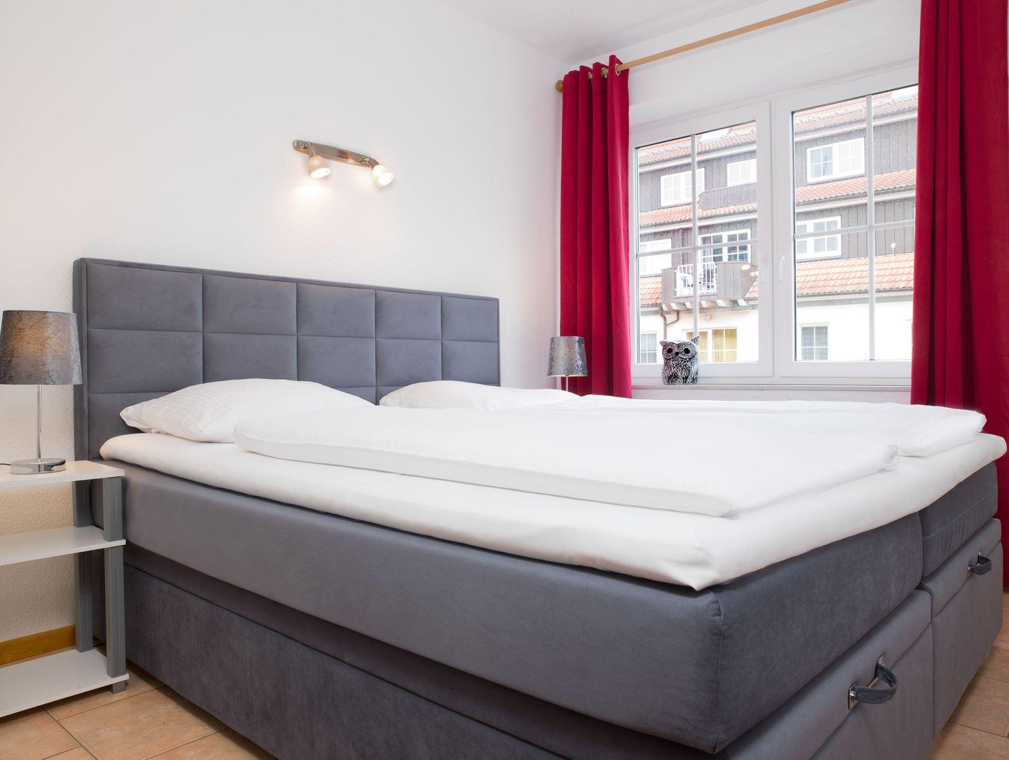 Das Schlafzimmer verfügt über ein kuscheliges Boxspringbett (180 x 200 cm). Das Bad ist mit einer Dusche, einem WC, einem Waschbecken und einer breiten Ablagefläche ausgestattet.