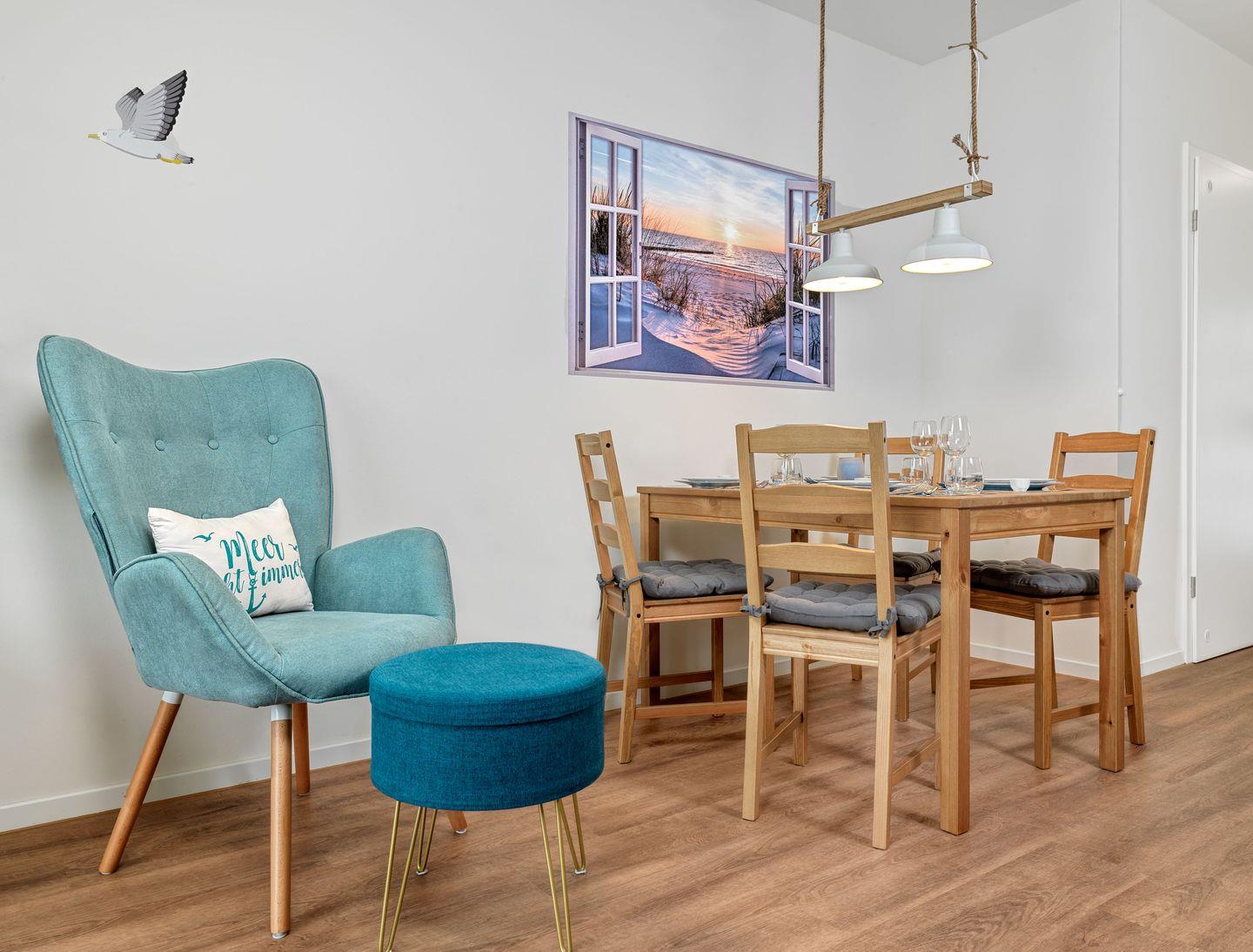 Das helle, freundliche Wohnzimmer mit offener Küche, Ess- und Wohnbereich verfügt über eine Schlafcouch für 2 Personen, sowie TV / Blu-ray / DVD / Radio mitsamt Surround-Anlage. Für einen gemütlichen Abend sind zudem Bücher und Gesellschaftsspiele vorhanden.