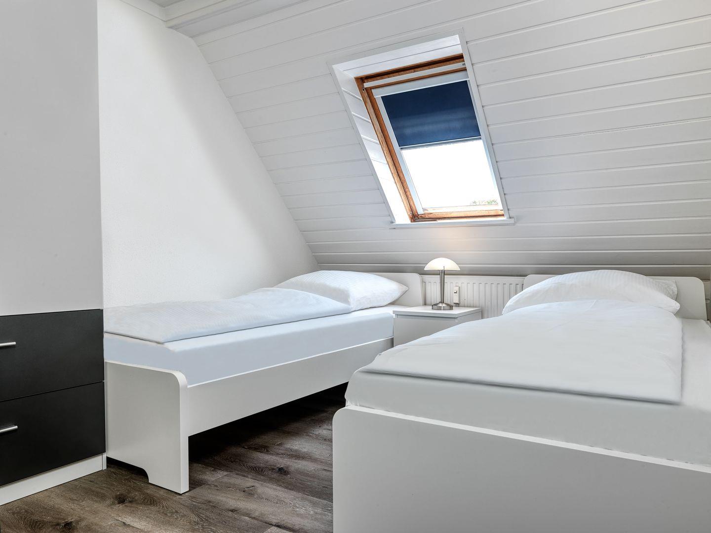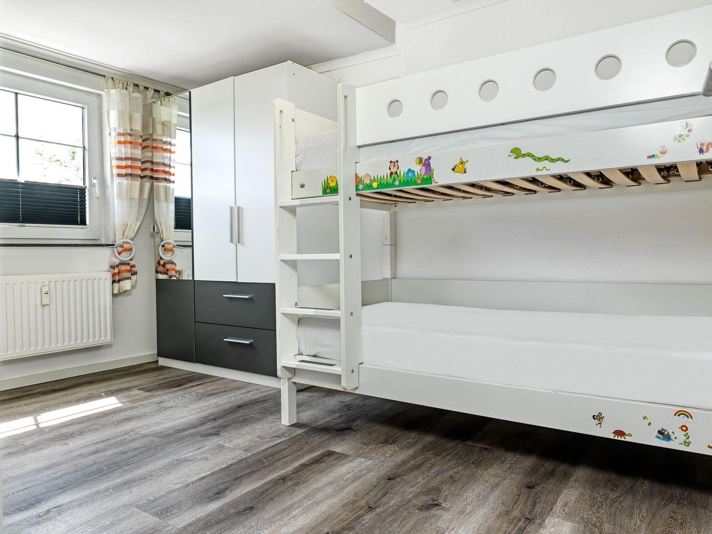 Im Obergeschoss erwarten Sie drei weitere Schlafzimmer, eines mit Doppelbett, das zweite mit zwei Einzelbetten und das dritte mit einem Etagenbett. Auf der Etage befindet sich ein weiteres Bad mit Dusche und WC.