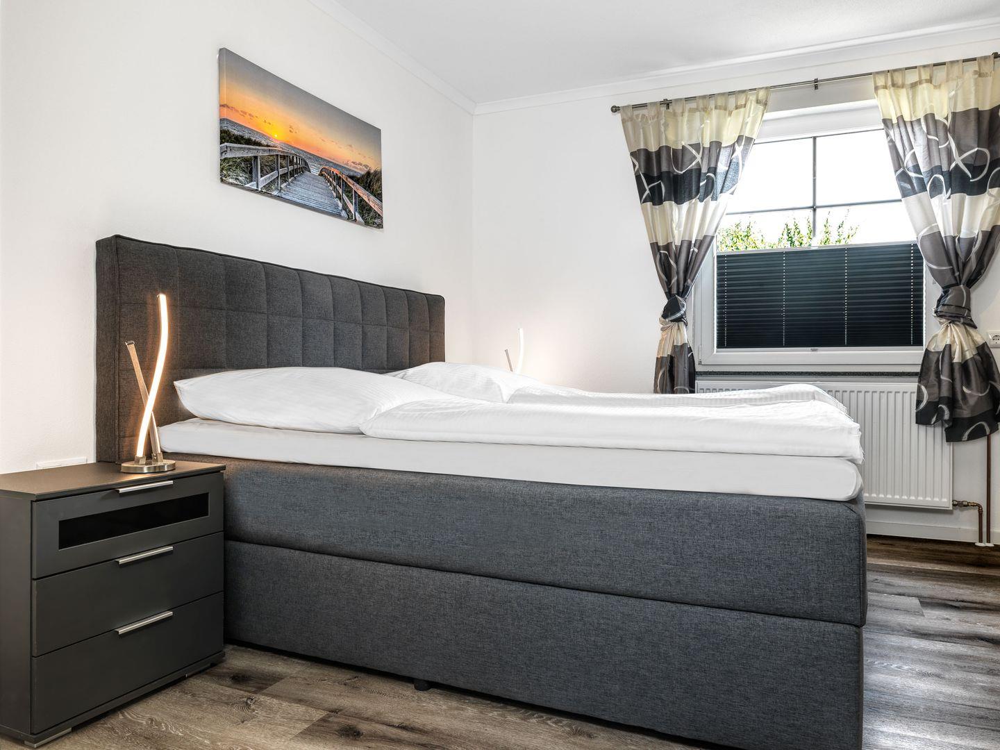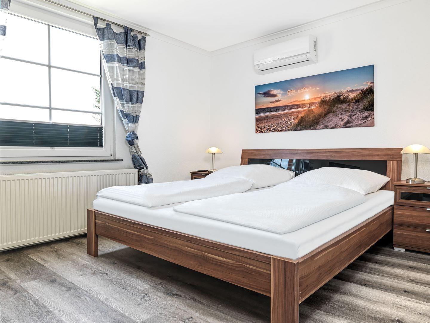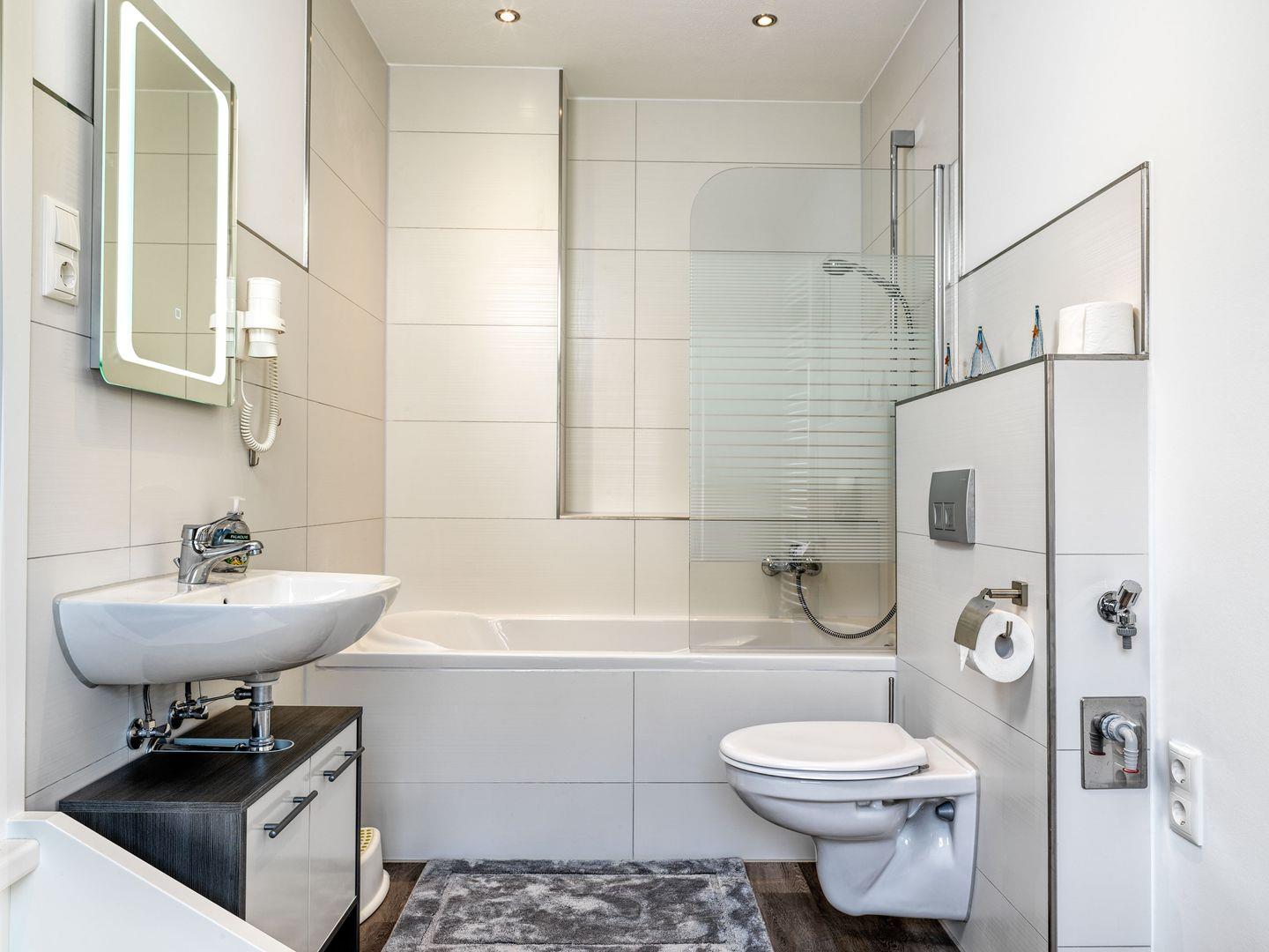 Im Erdgeschoss erwartet Sie ein großzügiger Wohnraum mit separatem Esszimmer und hellem Wohnzimmer sowie einem Bad mit Badewannne und ein Schlafzimmer mit Doppelbett. Ins Badezimmer führen zwei Treppenstufen.