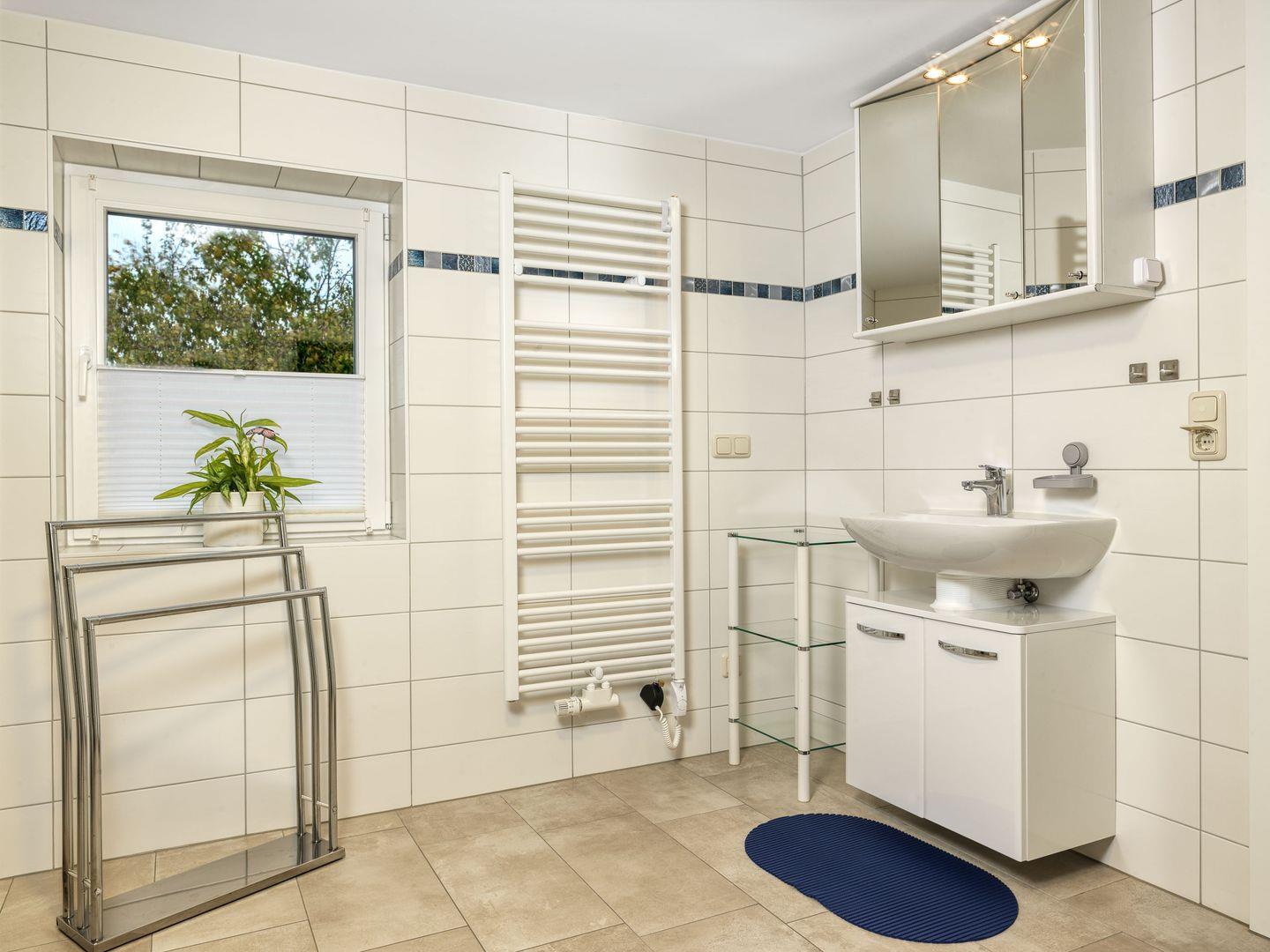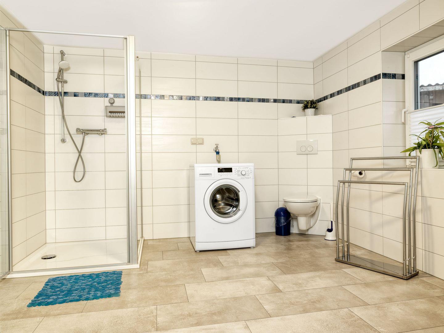 Das Badezimmer ist mit einer Dusche und WC-Kindersitz sowie einer Waschmaschine ausgestattet.