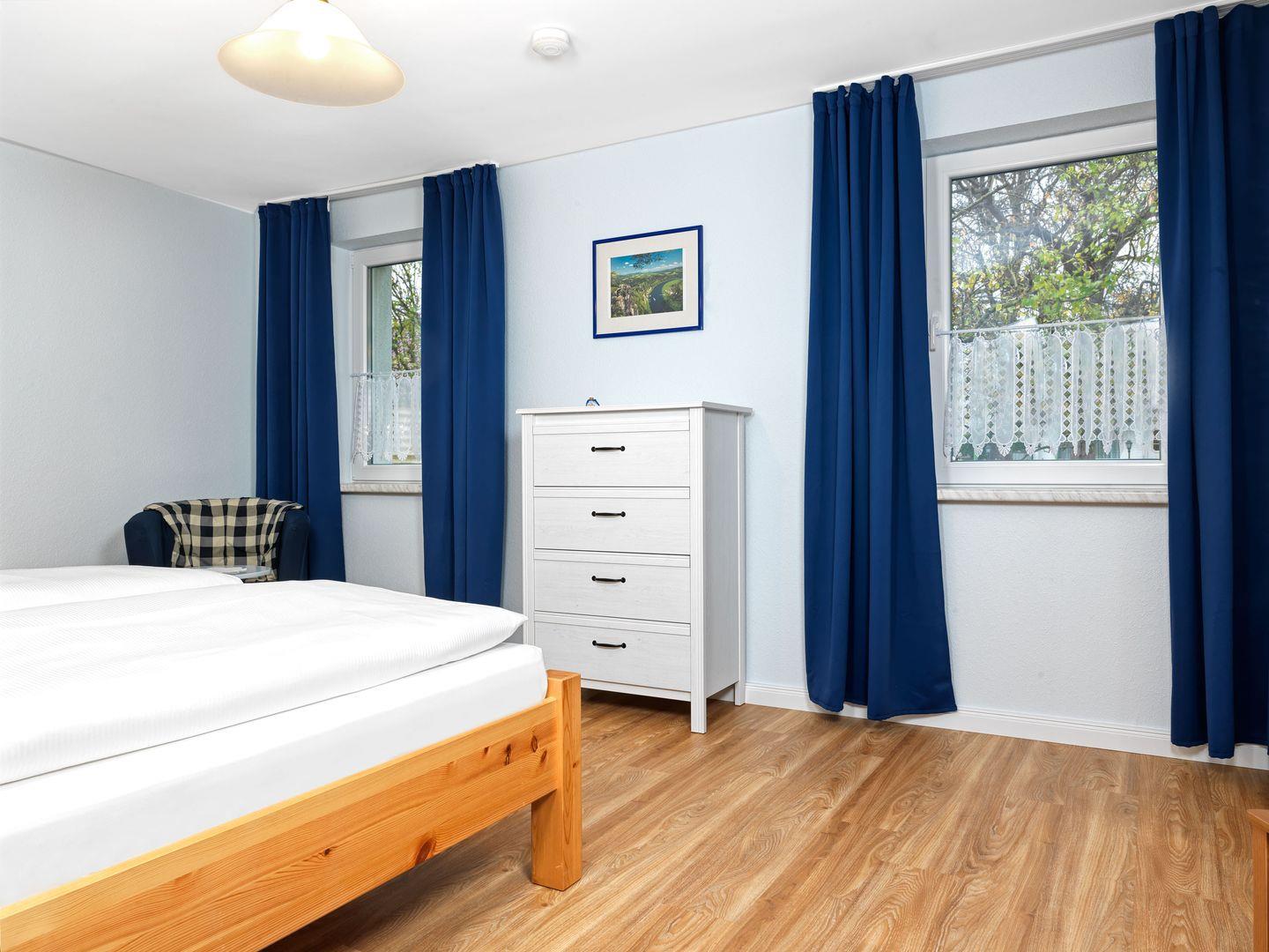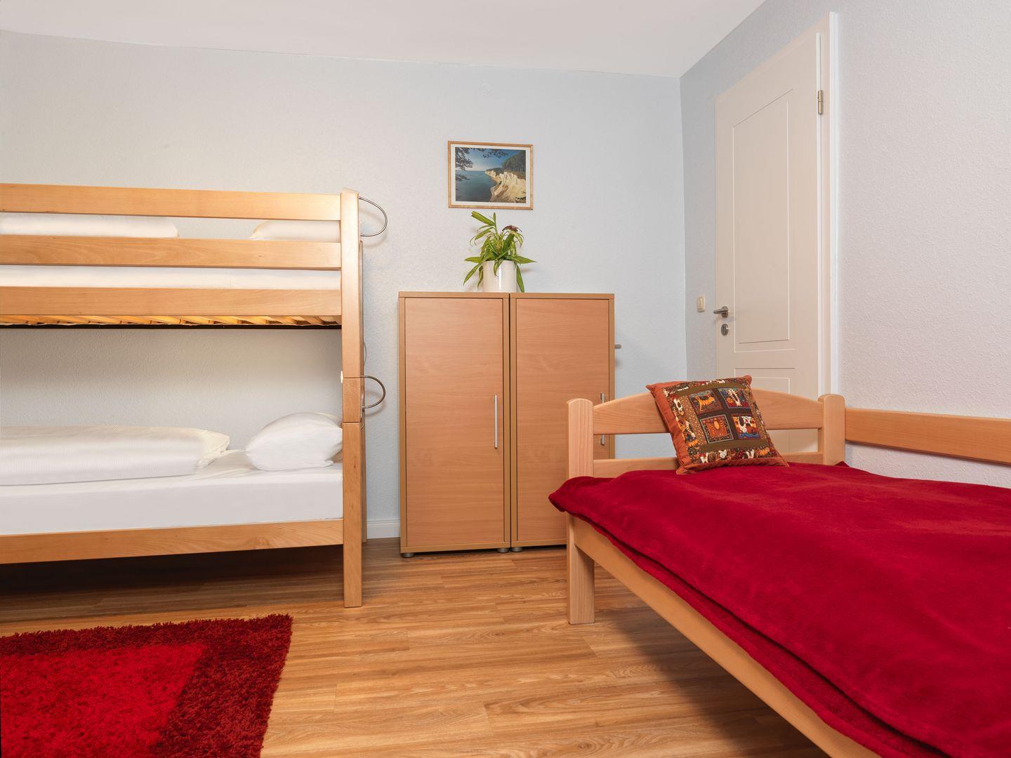 Ein Schlafzimmer mit Doppelbett und Kinderbett, sowie ein Schlafzimmer mit Doppelstockbett und einem Einzelbett bieten Ihnen erholsame Nächte.