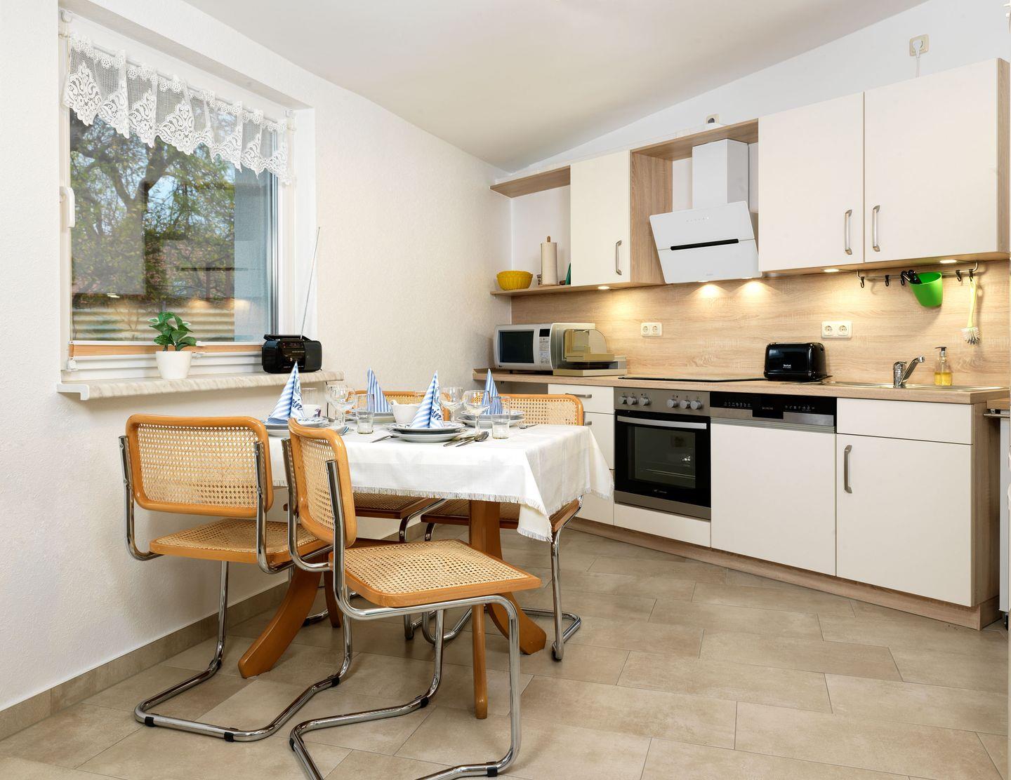 Voll ausgestatte Küche mit Geschirrspüler, Kaffeemaschine, Herd und Wasserkocher bieten alles, was Sie brauchen.