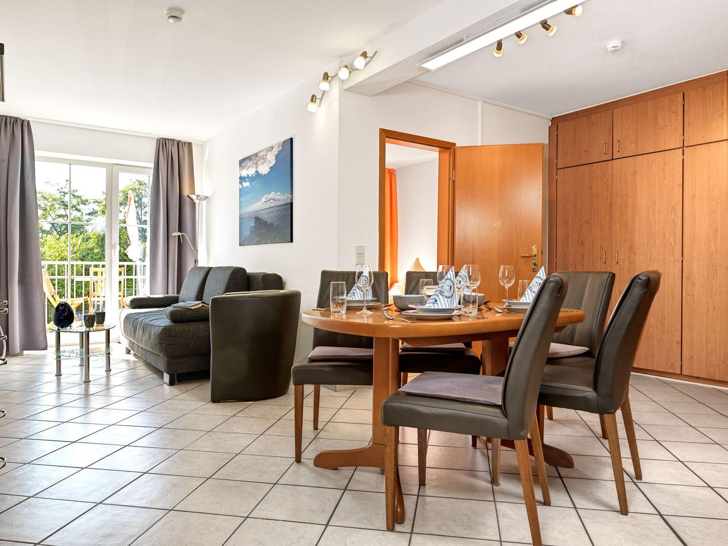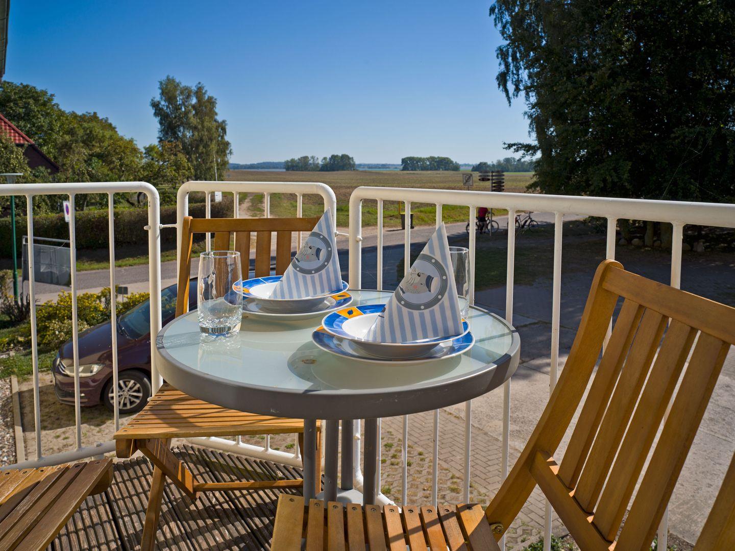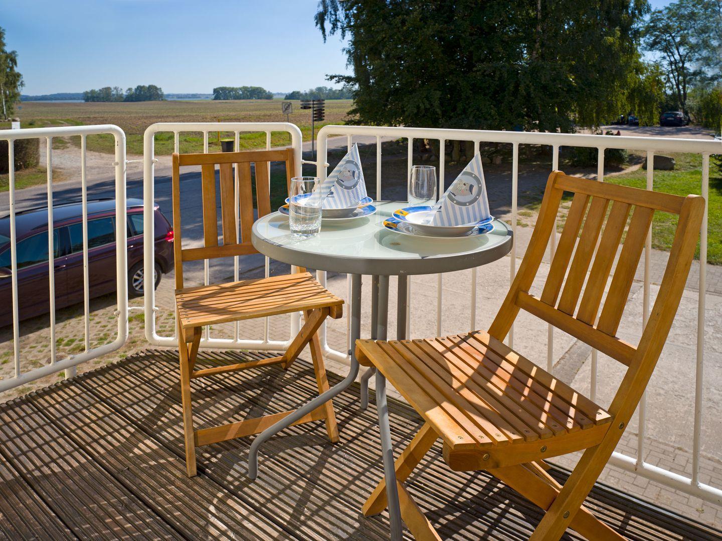 Vom Wohnbereich gelangt man auf den schönen Ost-Balkon mit Tisch, Stühlen und Blick zum Haff. Hier können Sie gemütlich frühstücken und die Morgensonne genießen.