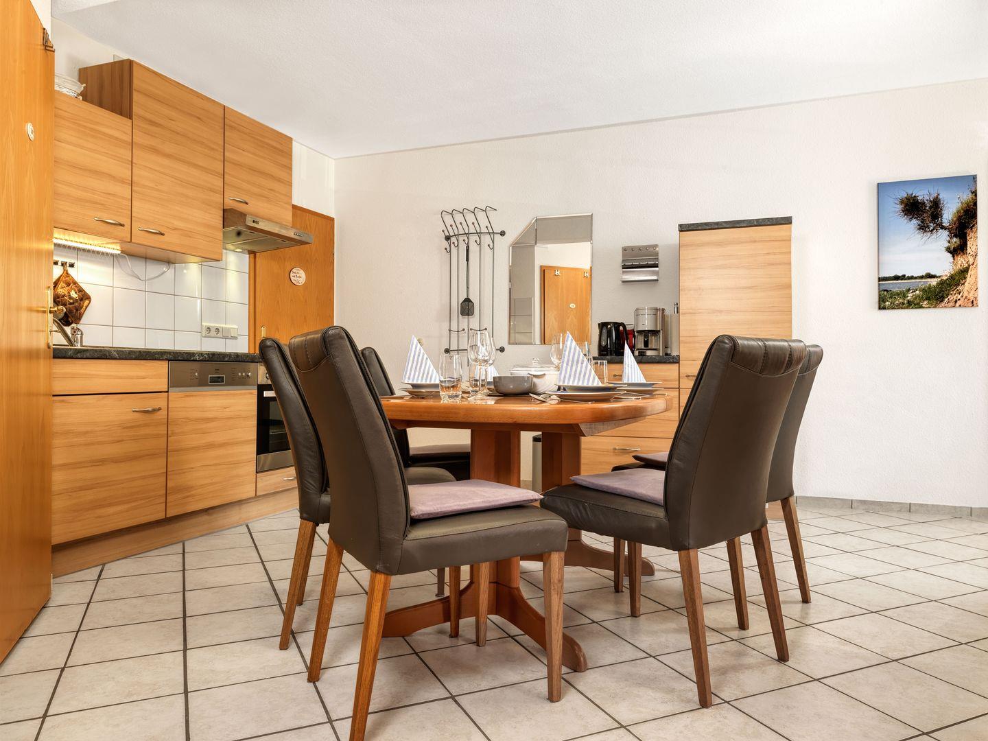 Die Wohnung besticht durch ihren großzügigen Wohn- und Essbereich mit einer offenen, gut ausgestatteten Küche, inklusive Cerankochfeld, Backofen, Kühlschrank mit Gefrierfach, Mikrowelle, Wasserkocher, Toaster und Kaffeemaschine und reichlich Geschirr.
