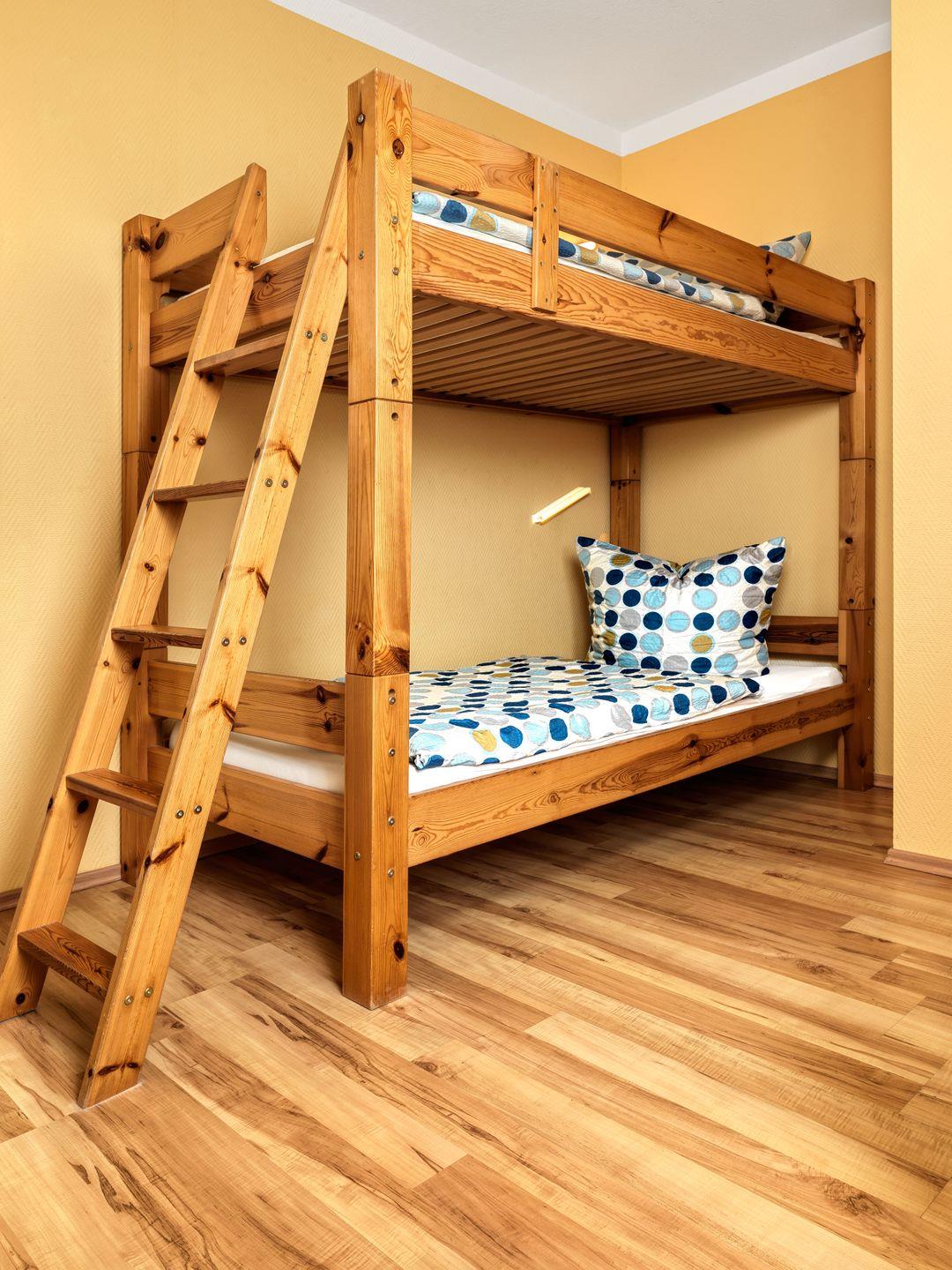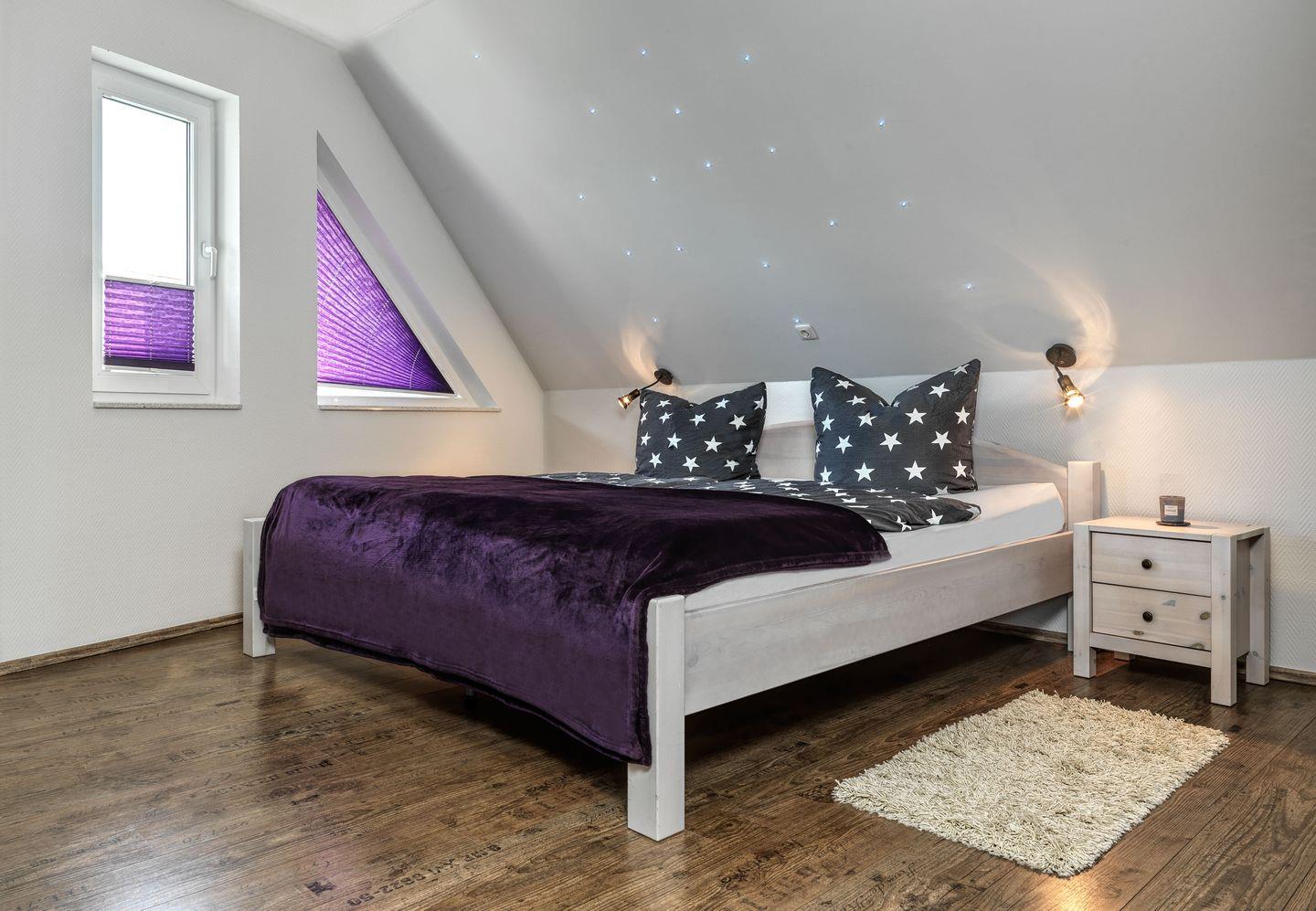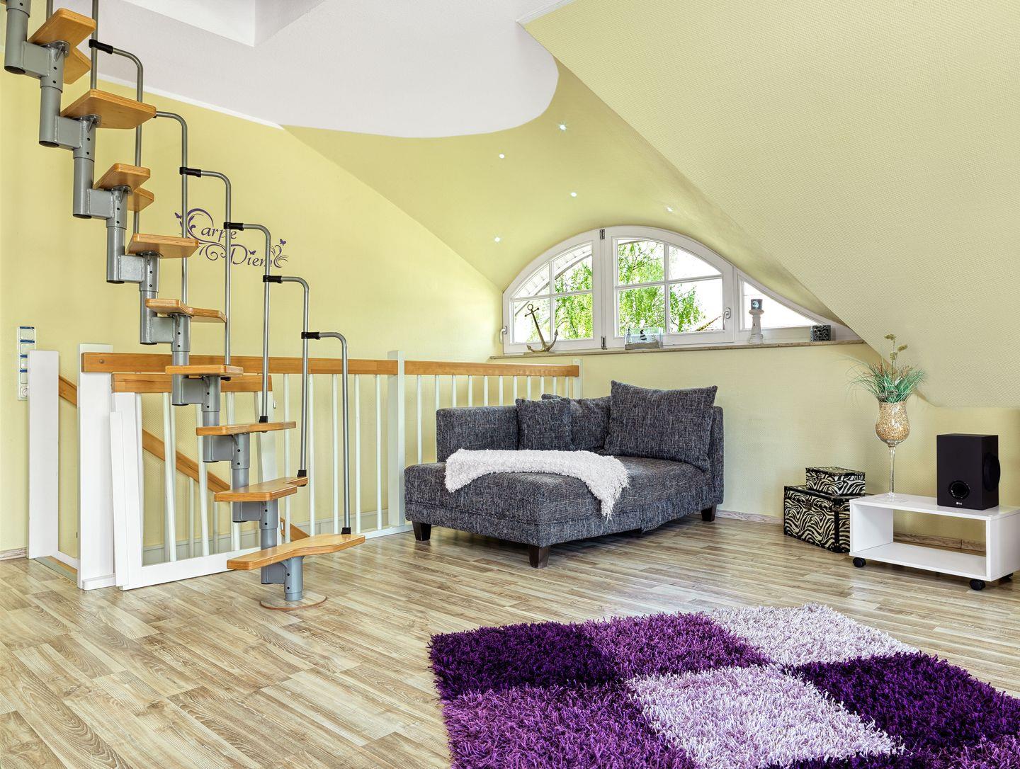 Über eine gewendelte Raumspartreppe gelangen Sie in den Schlafboden mit Doppelbett.