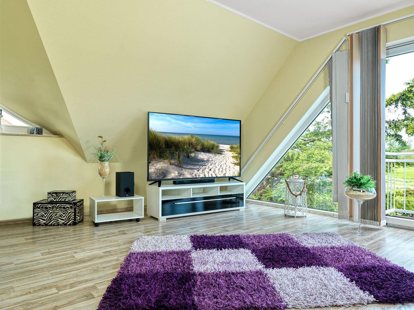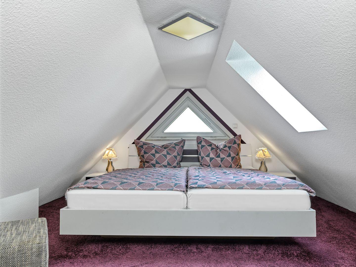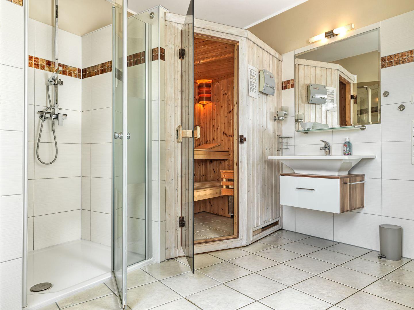 Im Obergeschoss gelangen Sie direkt ins geräumige Wohnzimmer mit großer Fensterfront, welches mit Flat-TV und DVD ausgestattet ist, von hier aus haben Sie Zugang zu einem weiteren Schlafzimmer mit Doppelbett und einem Wellness-Bad, welches keine Wünsche offen lässt. Das Bad ist ausgestattet mit Dusche, WC und Sauna.