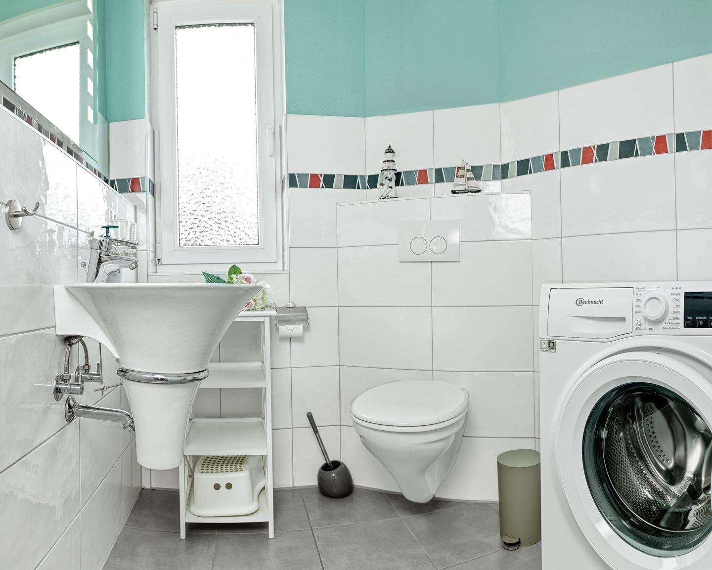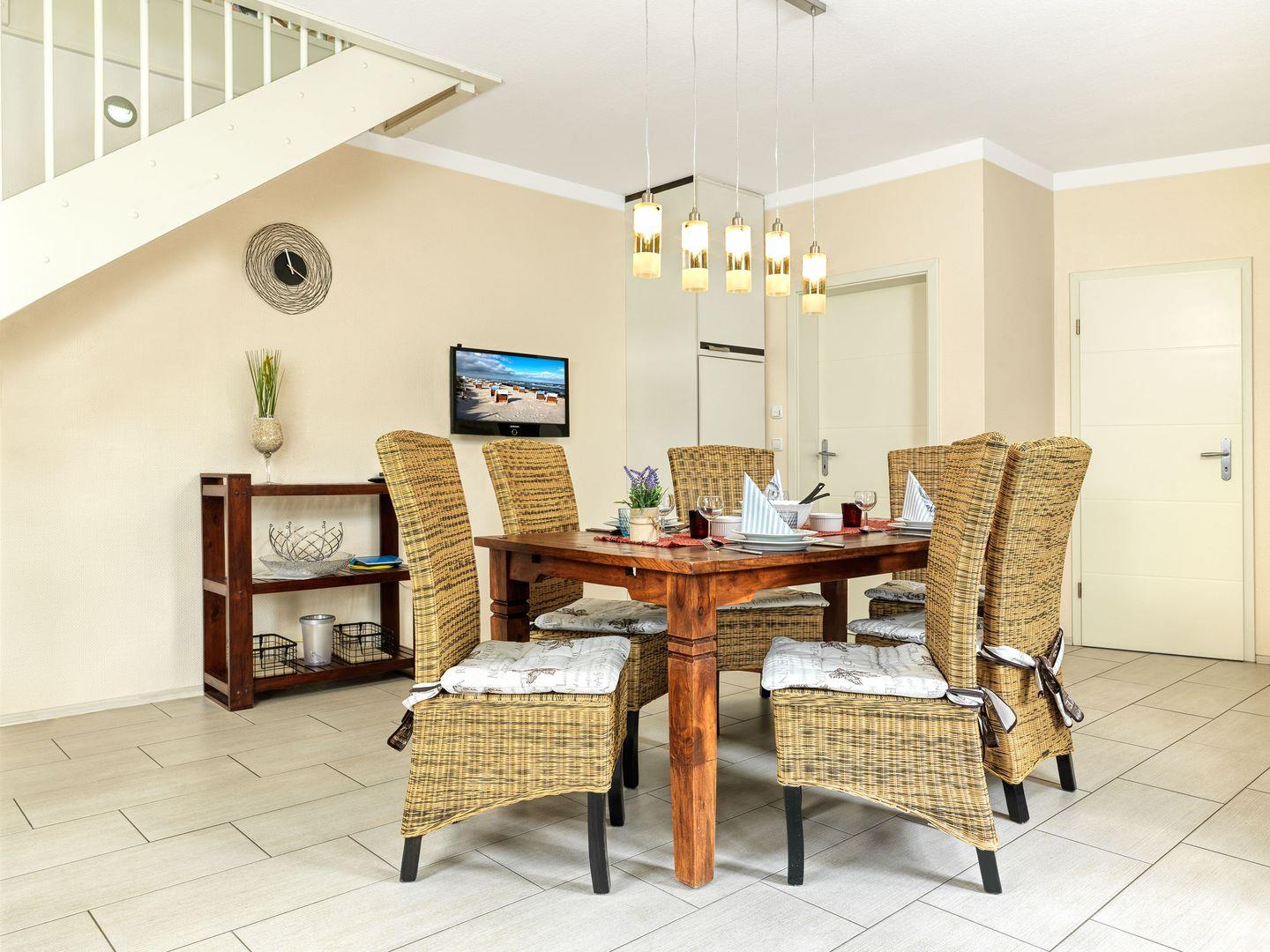 Im Erdgeschoss/ Eingangsbereich befindet sich der großzügige, lichtdurchflutete Wohn-Essbereich mit offener Einbauküche mit Geschirrspüler, Backofen, Cerankochfeld, Mikrowelle, Kühlschrank mit kleinem Gefrierfach, Kaffeemaschine, Wasserkocher, Toaster, Radio/CD und einem großem Esstisch an dem man schöne Spieleabende mit der Familie verbringen kann, sowie TV. Weiterhin befindet sich hier ein Schlafzimmer mit Etagenbett, sowie ein Gäste-WC mit Waschmaschine.