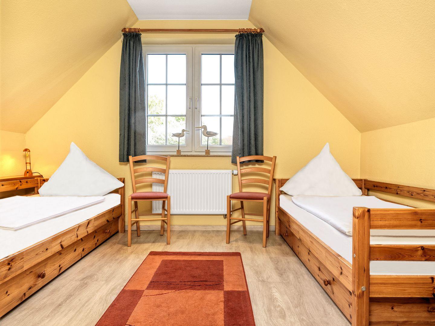 Darüber hinaus gibt es ein zweites Schlafzimmer mit zwei Einzelbetten (ein Einzelbett mit 2. Rollrost zum ausziehen) so dass 5 Personen dort untergebracht werden können.