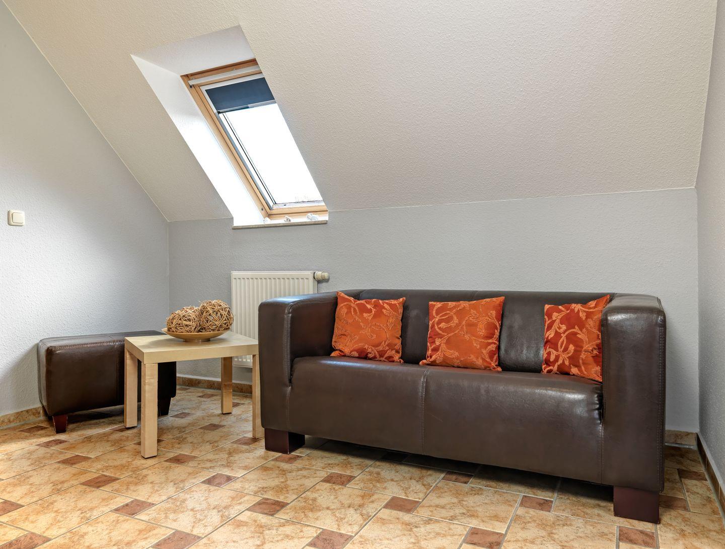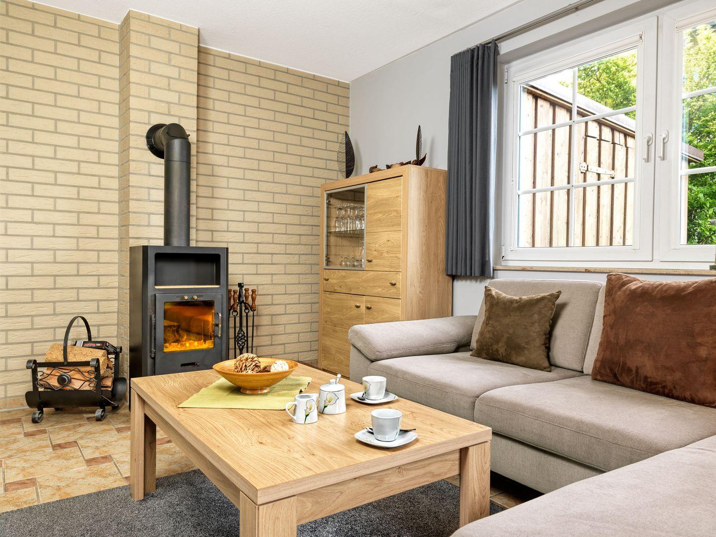 Das Wohnzimmer ist mit einem Kaminofen, Wohnlandschaft und SAT-TV/DVD ausgestattet.