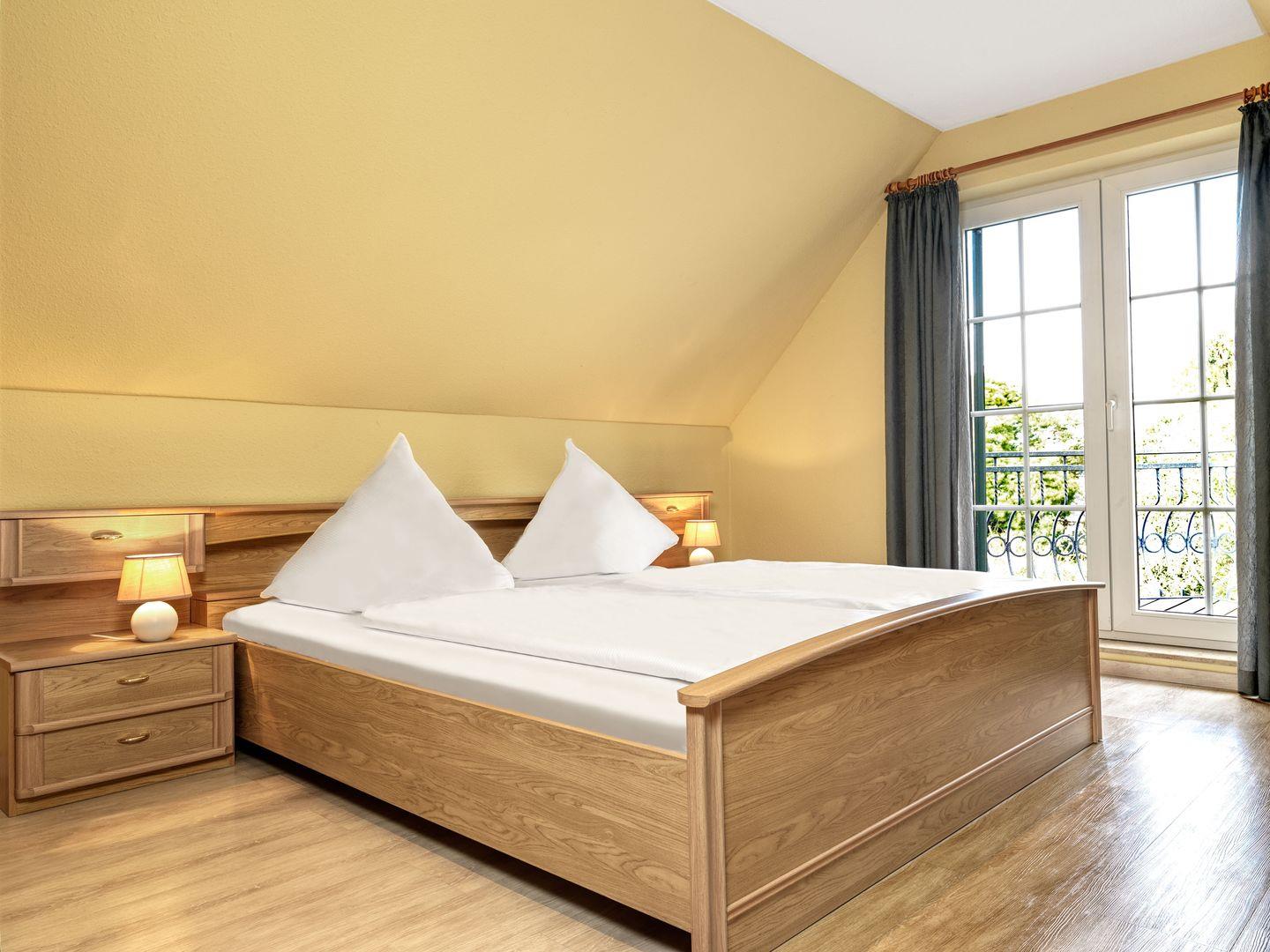 Im Obergeschoß befindet sich das Schlafzimmer mit Doppelbett und Balkon