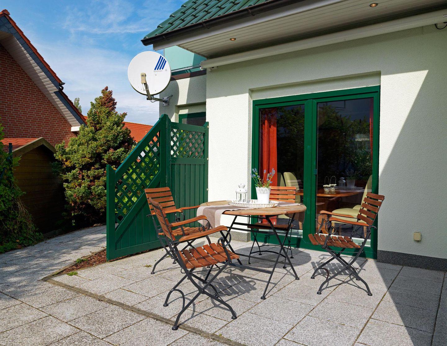 Genießen Sie schöne Tage auf der Terrasse mit Gartenmöbeln, Sonnenliege und Grill.