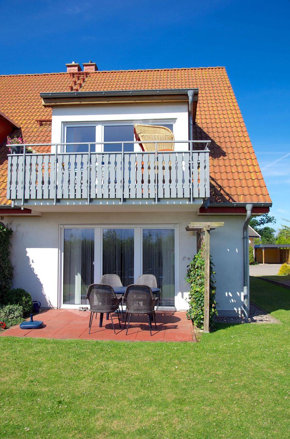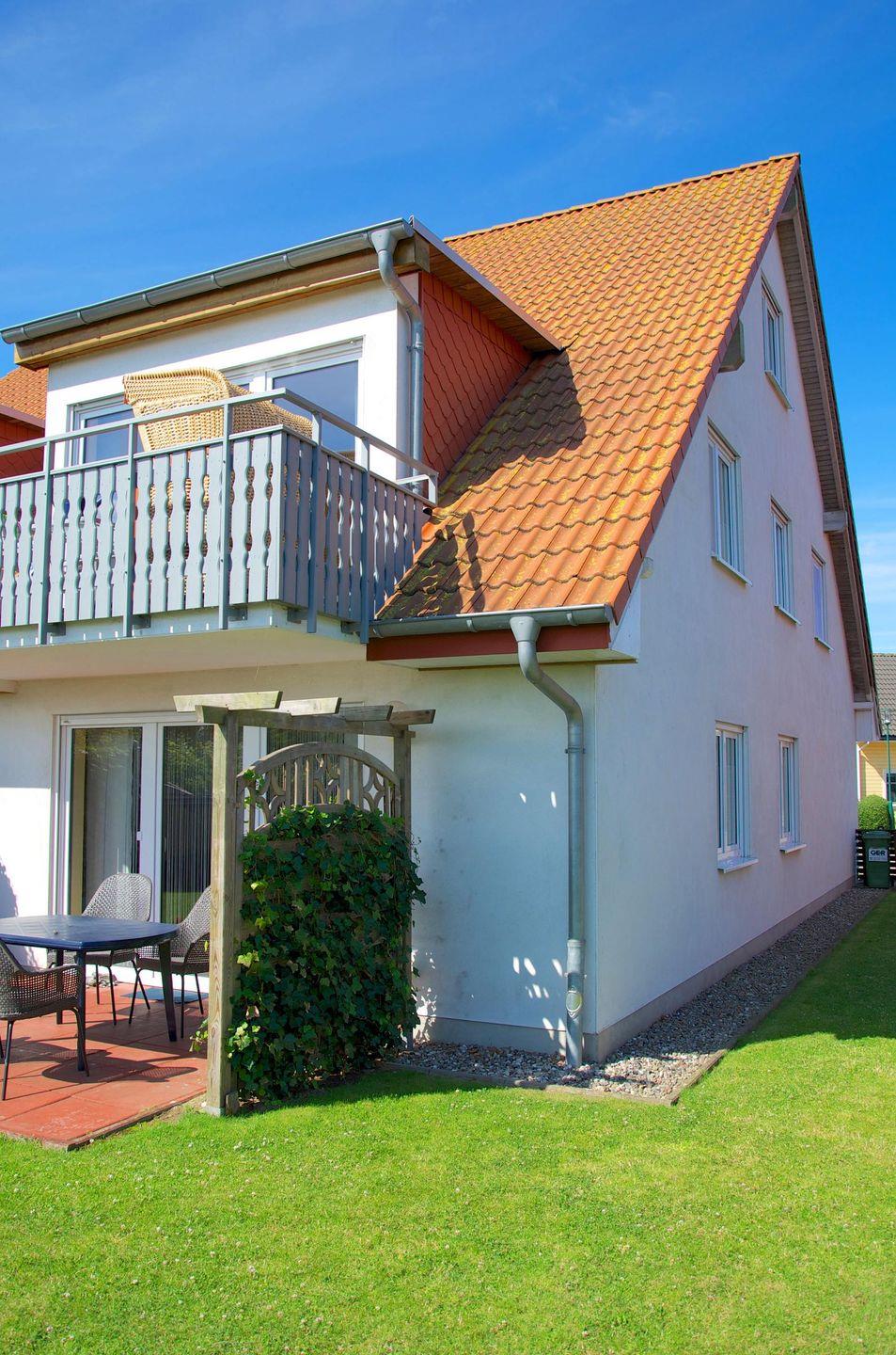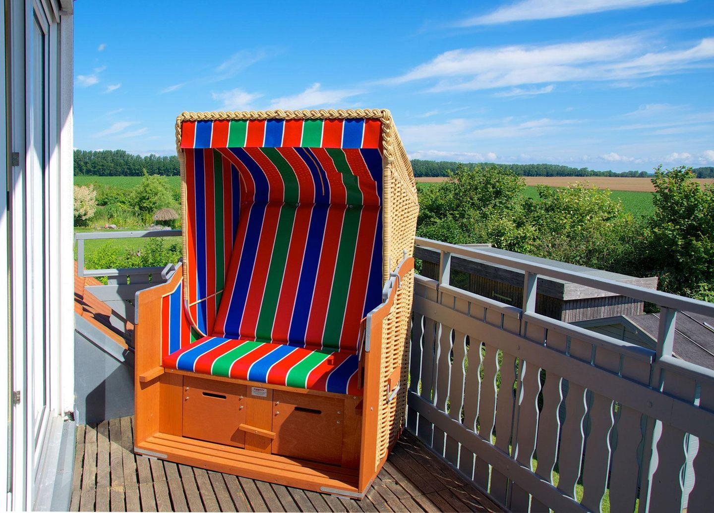 Komfort und Ausstattung: Großer Balkon mit Strandkorb, ein PKW-Stellplatz direkt am Haus, sowie ein abschließbarer Schuppen für Fahrräder.