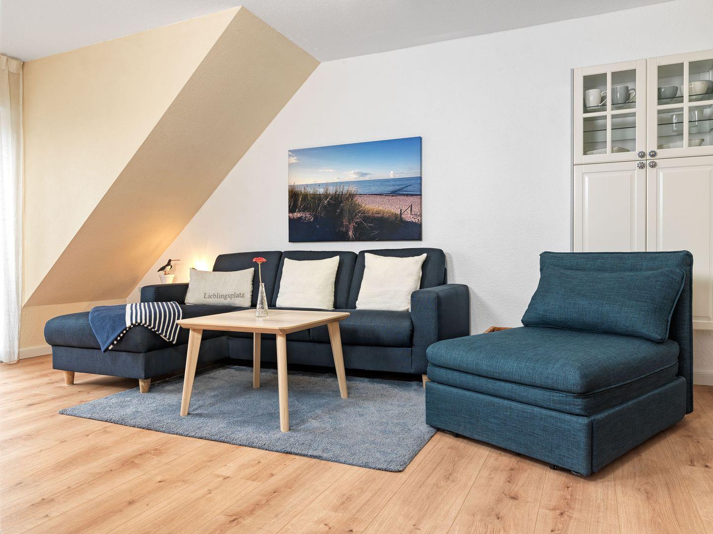 Zusätzlicher Schlafplatz: Im Wohnzimmer steht ein gemütlicher Schlafsessel bereit, der sich ideal für eine dritte Person eignet.